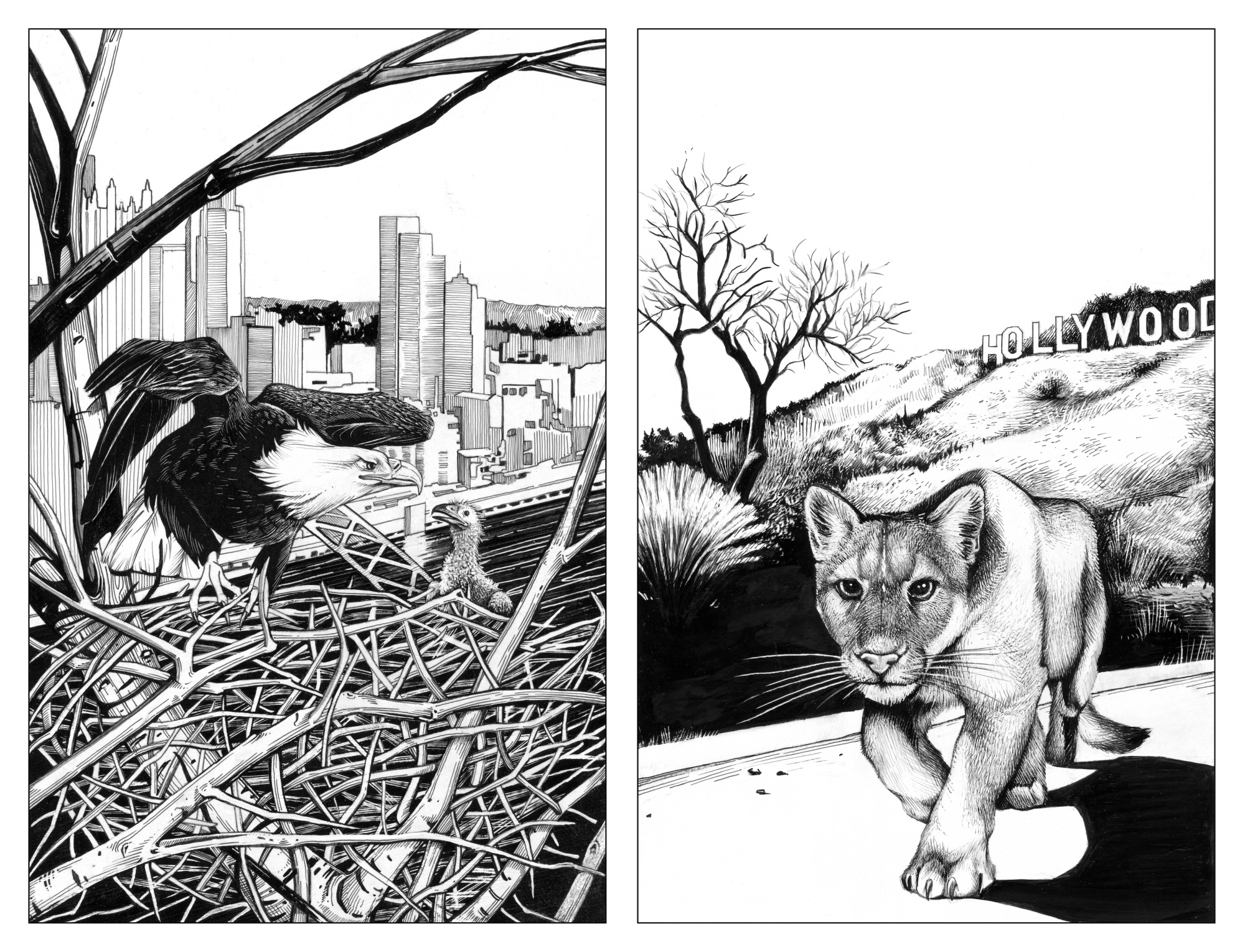 随着匹兹堡地区从后工业时代恢复,像白头海雕这样的猛禽回归了。在洛杉矶的边缘一直存在着大猫,但在2016年,一只被称为P-22的美洲狮进入了城市。插图:简·金,Ink Dwell工作室/由加利福尼亚大学出版社提供然后还有在郊区进行的保护活动。在东海岸和中西部,努力恢复白尾鹿种群的努力——这些种群在19世纪大幅下降,跌至其历史数量的5%——使得这些生物开始在像郊区这样的地区定居,因为在二战后,郊区的扩张更加广泛。