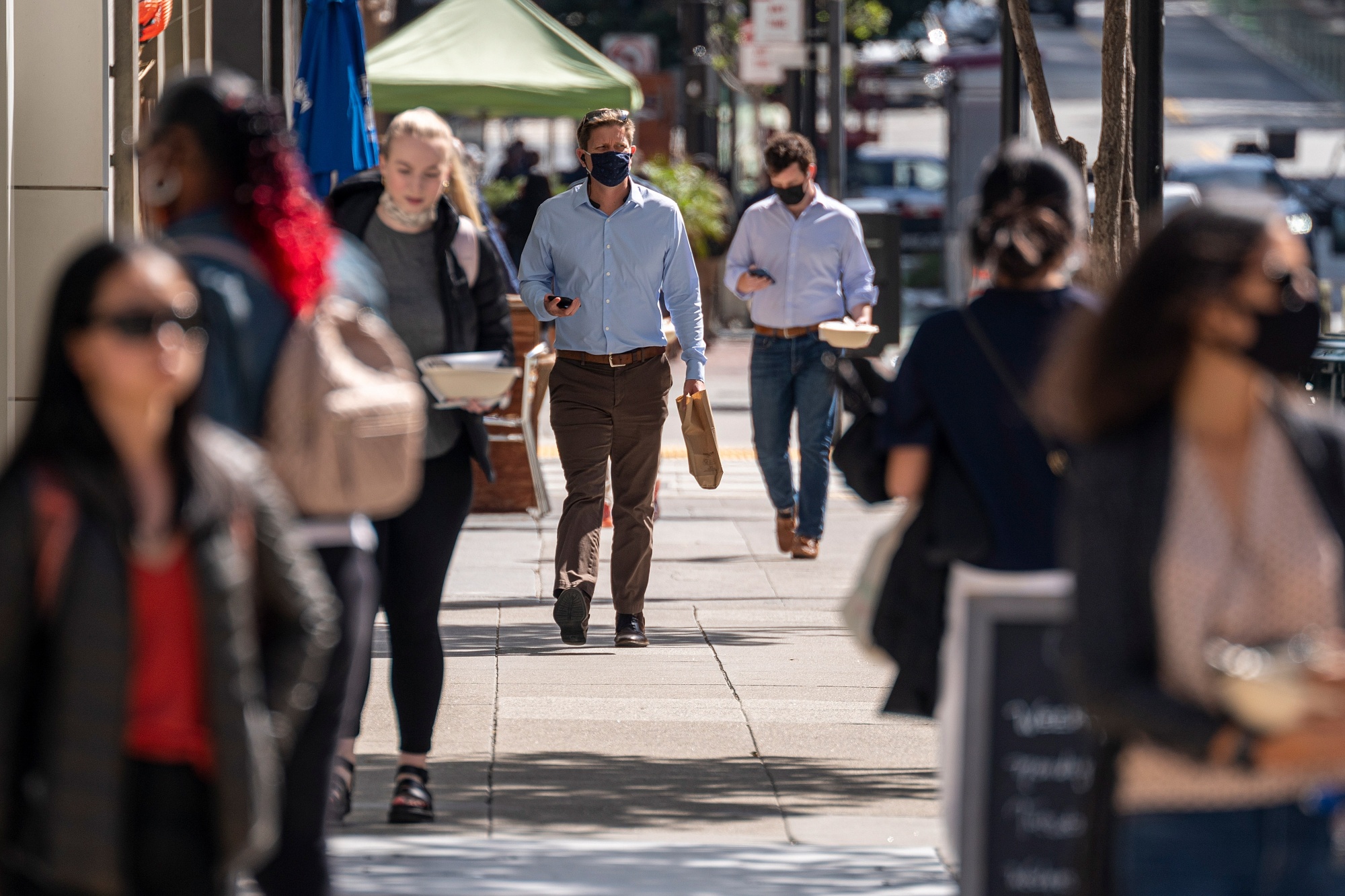 工人们在美国加利福尼亚州旧金山的第二街上带着午餐外卖,2021年10月5日星期二。根据卡斯尔系统的数据,截至9月22日,大约21%的旧金山地区办公室工作人员已经返回,这个数字自夏季以来几乎没有变化,是10个美国大都会区中最低的。摄影师:David Paul Morris/Bloomberg节目提示:千禧一代正在早早为退休存钱。这对他们的未来意味着什么?加入我们 今天下午12:30美东时间参加现场Twitter Spaces讨论。