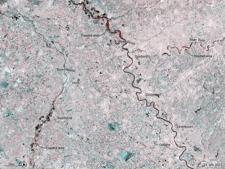 这幅雷达图像利用Sentinel-1任务捕捉的信息显示了德国洪水的范围,用红色表示。来源:欧洲航天局阅读更多:气候变化使德国的致命洪水更有可能发生