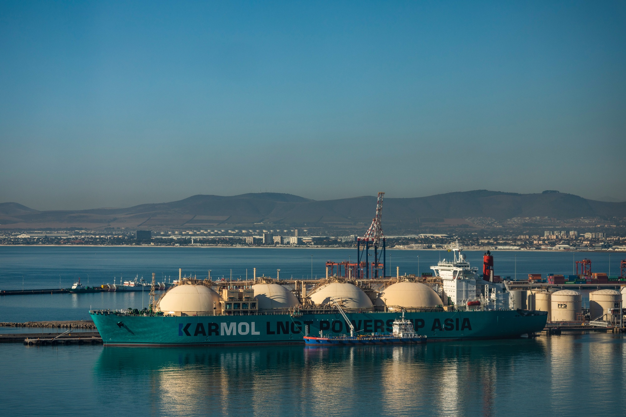 4月19日,停靠在开普敦港口的Karmol LNGT Powership Asia 浮式储存和再气化装置。摄影师:Dwayne Senior/Bloomberg### 过去与现在