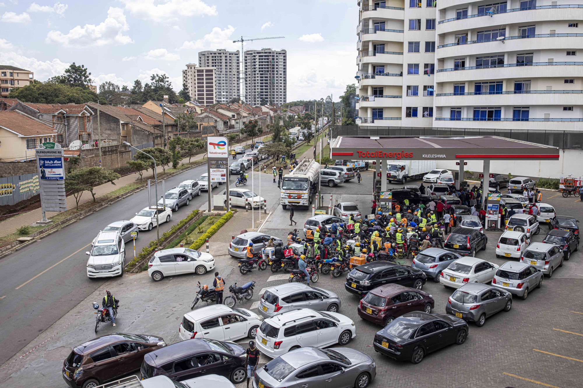 司机们在肯尼亚内罗毕的一个加油站排队装满汽油。