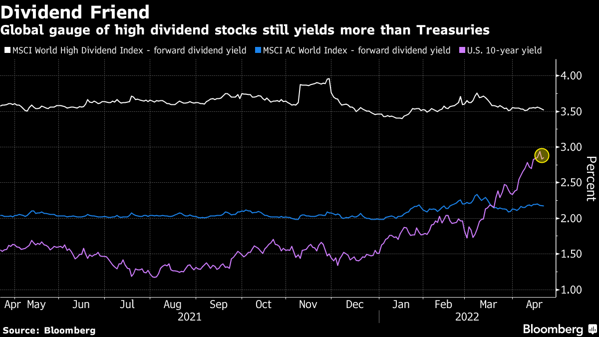 股市中的收入基金经理仍然可以安然入睡 —— 债券恶霸们还没有来抢他们的零花钱。尽管国债收益率的上升已经超过了全球股票的平均股息,但对于投资者实际上倾向于购买以获取收入的股票而言并非如此。MSCI世界高股息指数的收益率为3.5%,远高于美国债券基准的2.90%和全球股票指数的2.2%。MSCI指数仅包含提供“明显”高于平均股息收益率并通过支付可持续性筛选的股票。在今年动荡的全球金融市场中,它表现出弹性,总回报略低于零,而MSCI AC世界指数亏损11%,彭博的国债指数亏损约9%。