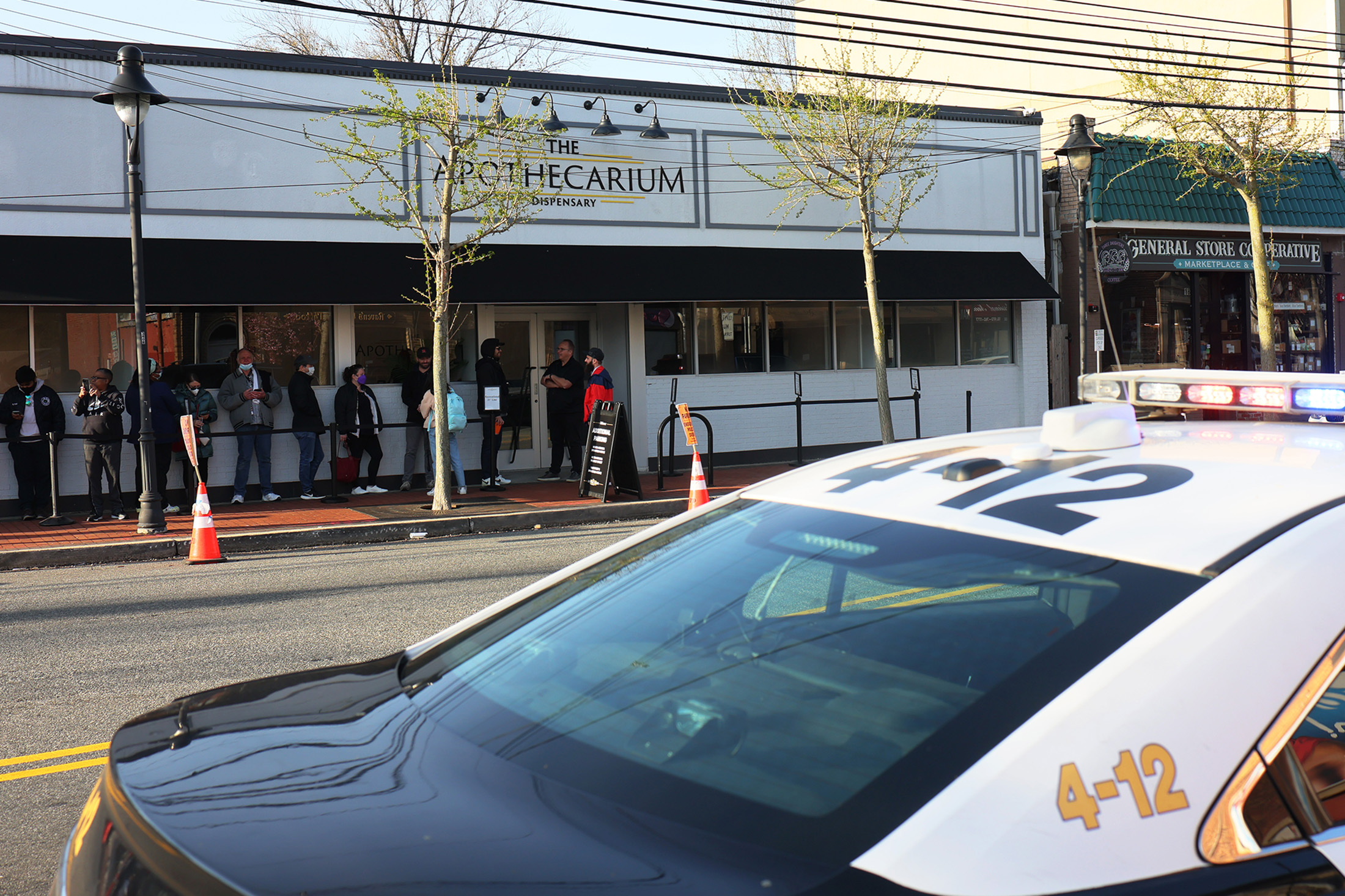 一辆警车停在新泽西州梅普尔伍德市一家大麻零售店外,居民们在等待进入,这是梅普尔伍德市的娱乐销售的第一天。