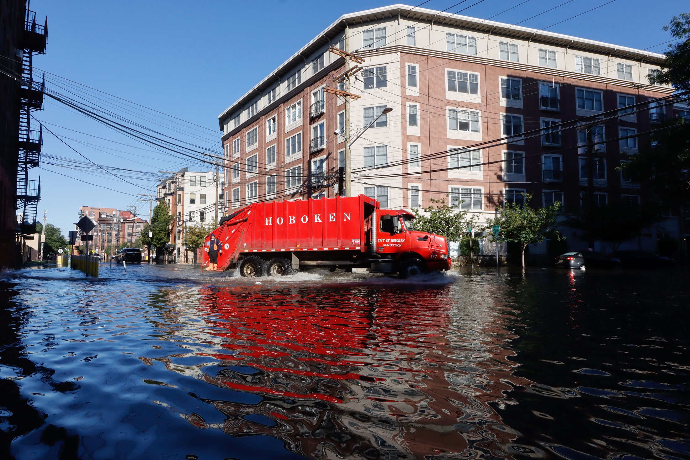 一辆环卫车驶过霍博肯的被淹街道,这是在2021年飓风艾达的残余席卷纽约市和新泽西地区的第二天早晨。