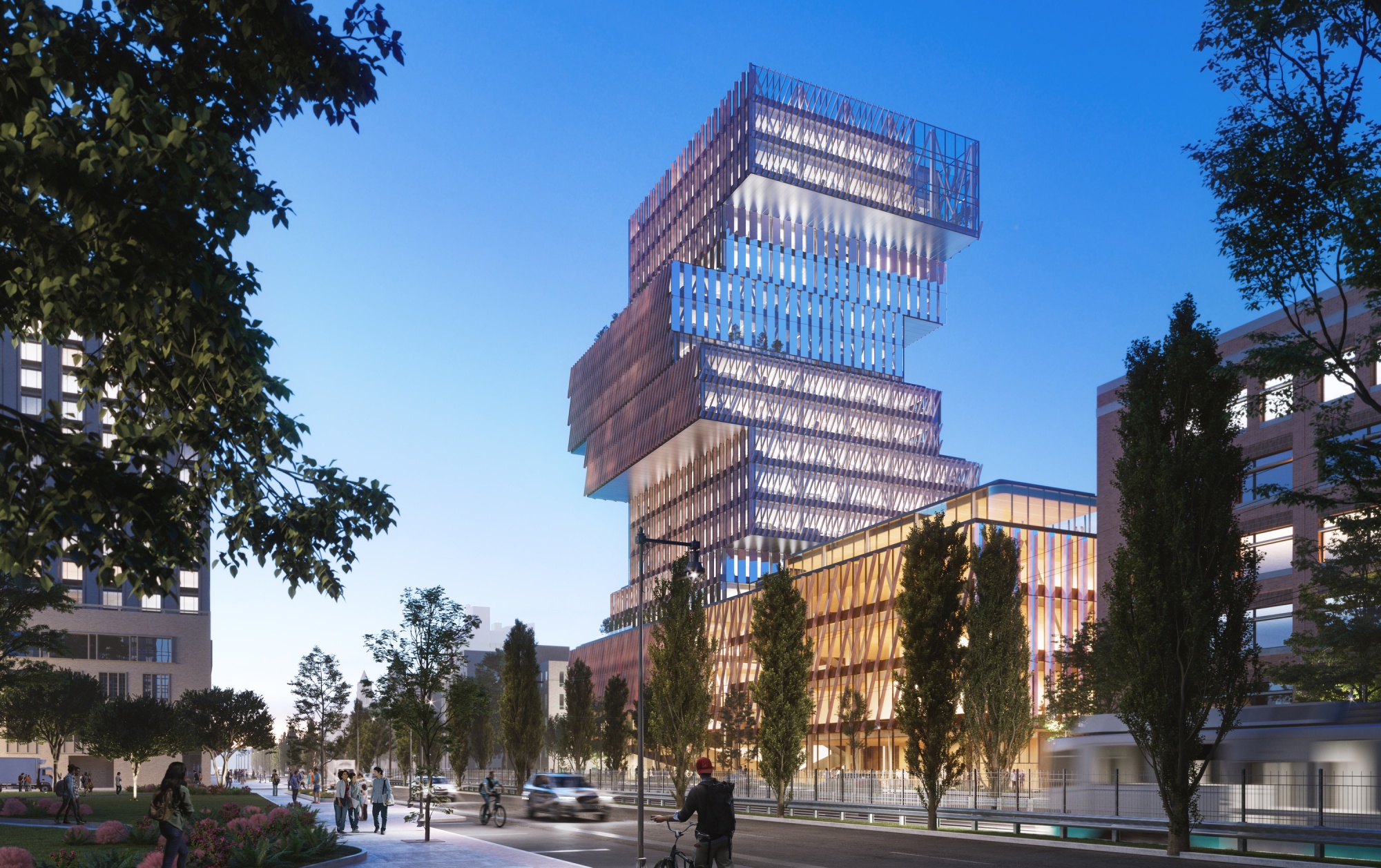 这不仅仅是一时的奇想,建筑公司KPMB的合伙人保罗·罗查说。“我们把它看作是一个垂直校园和一个邻里的堆叠,”他说,不同的部门和学院可以在不同的区域聚集和合作,每个区域都有自己的露台作为户外空间——这是疫情后的一个关键便利设施。“我们制定了一些指导原则,我们遵循这些原则是相当理性的,但对于观察者来说可能看起来非常自发。”