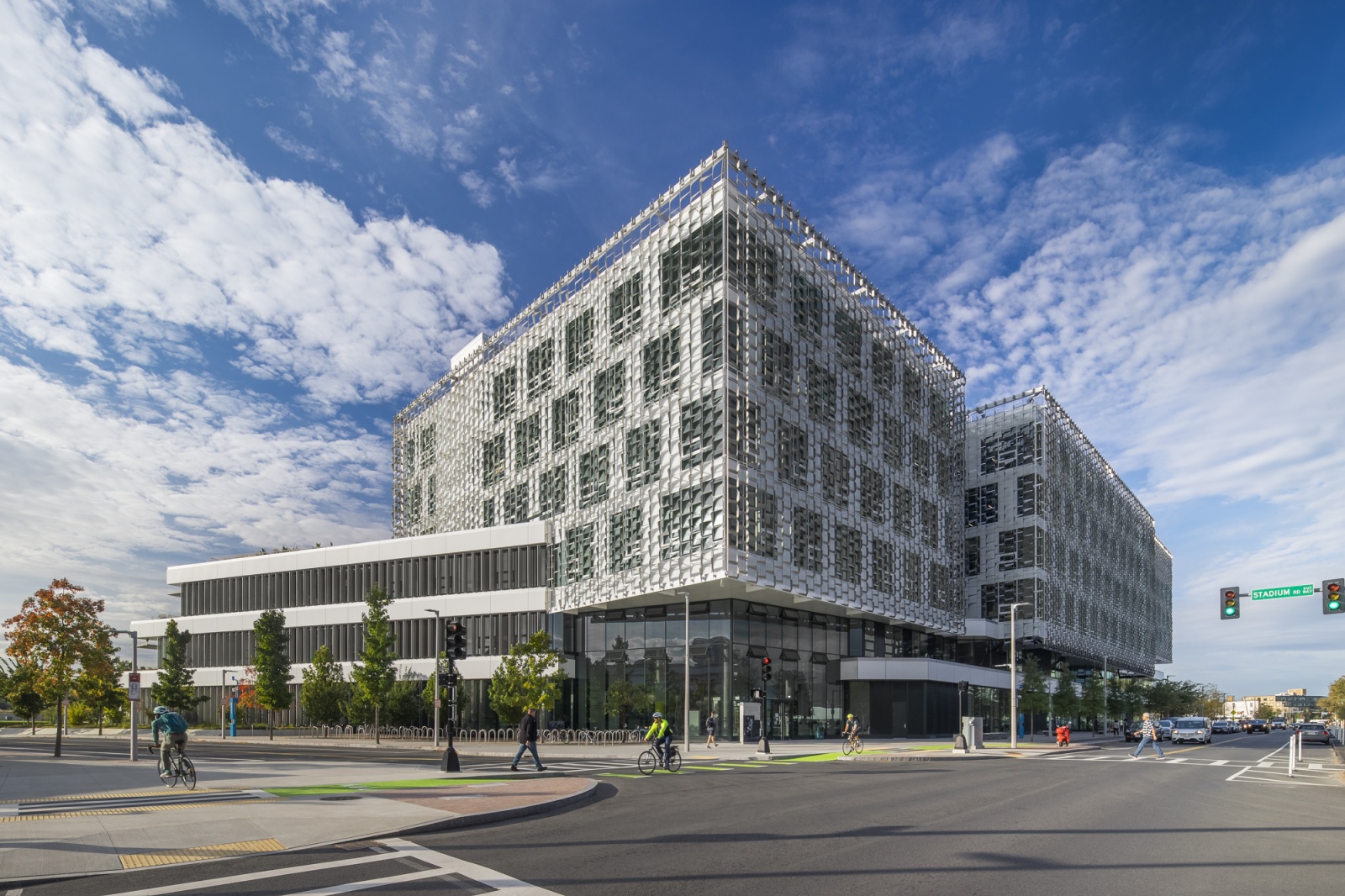 建筑物的钢网外墙设计旨在降低冷却成本。摄影师:Brad Feinknopf“能源效率是我们的一项关注重点,”德国Behnisch Architekten的合伙人Robert Matthew Noblett说。“对我们来说,建筑物的外观与其性能息息相关非常重要。尽管房地产市场可能喜欢建造这种时尚的玻璃办公大楼,但作为建筑师,我们知道的东西,我不认为我们可以负责任地继续这样做。”