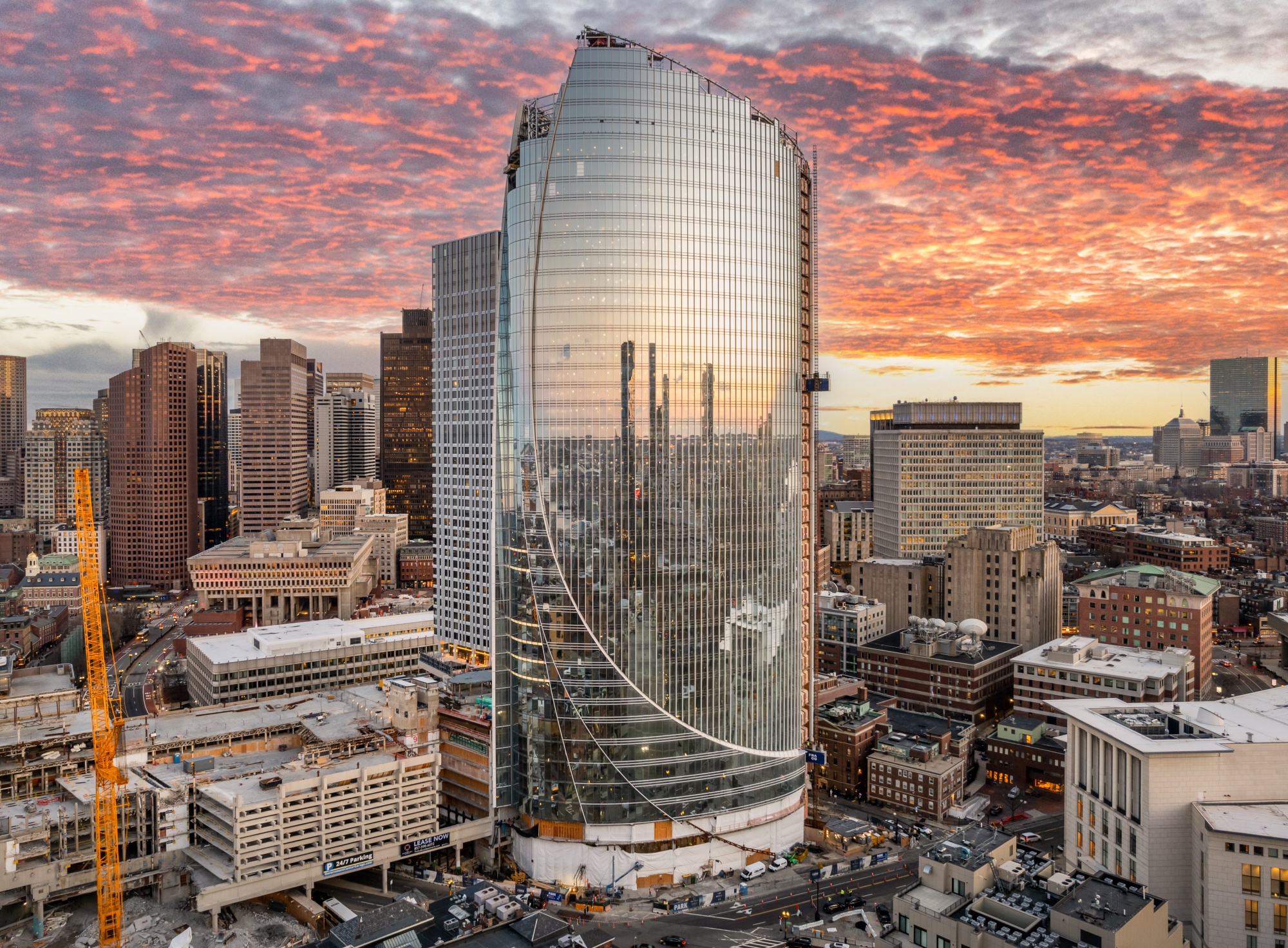 由Pelli、Clarke & Partners/CBT设计的新One Congress办公楼即将在波士顿市中心完工。其椭圆形底座建在政府中心综合体旁边的一块拐角地段。图片来源:HYM投资集团乍一看,位于布尔芬奇三角地区的One Congress,一个椭圆形的43层办公大楼,靠近凯尔特人队和勇士队比赛的体育场,不是非常激进——不完全是Lady Gaga会穿去格莱美奖的礼服。但建筑也不完全保守。继续这个隐喻,在底部,它有点像一条拉开来露出一些腿的长裙——或者,正如建筑师Mark R. Shoemaker所说,一件绅士大衣被附近波士顿港吹来的微风推开。椭圆形是最适合该地点的形状,这是一个再开发项目。庞大的政府中心停车场是在城市更新时期对该地区进行大规模推倒后铺设的,现在正在被逐步拆除,并由综合用途的多个建筑物取而代之。One Congress必须被嵌入一个角落位置,但又足够大以满足开发商HYM投资集团的面积需求。它位于Faneuil Hall市场、北端和布尔芬奇三角地区的酒吧林立的低矮砖建筑附近的中心位置,这让团队考虑到要做一些戏剧性的东西,因为这座建筑将从许多不同的角度被看到,在城镇的一个热闹区域。尽管表面采用传统的玻璃幕墙,但表面的体量被长长的、纤细的线条打破,显示出被剥离的层次。椭圆形的形状在向上延伸的长曲线中得到体现,就像在沙滩上轻柔的波浪。银白色的材料即使在阴郁的日子里看起来也很明亮,颜色调色板将被其他建筑物共享,因此多个结构将相互关联。但没有人会弄错谁占据中心舞台:One Congress在营销材料中被称为“奖杯”,想想也是,这座建筑确实有点像奖杯。