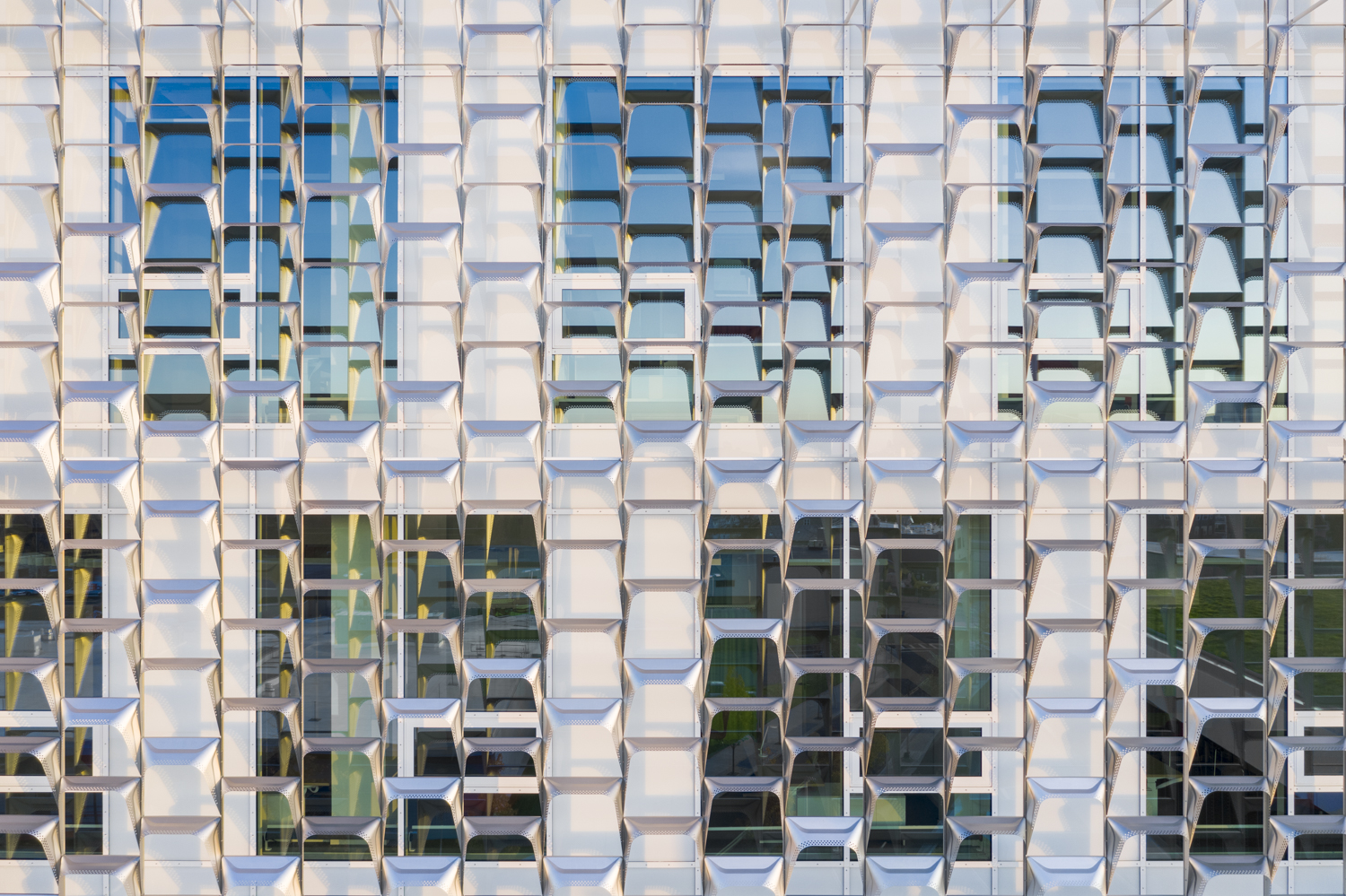 哈佛大学奥尔斯顿校区的新科学与工程综合体,由Behnisch Architekten设计。摄影师:Brad Feinknopf要理解哈佛大学奥尔斯顿校区的第一座重要新建筑——科学与工程综合体,需要一分钟的时间:这座建筑被一层闪亮的网状外皮覆盖,由数百个三角形不锈钢刀片组成,采用了一种称为水压成形的工艺制造。但这不仅仅是外部装饰。这种几何状的外墙将有助于保持建筑物的凉爽,延续了20世纪初由勒·柯布西耶提出的遮阳板概念。
