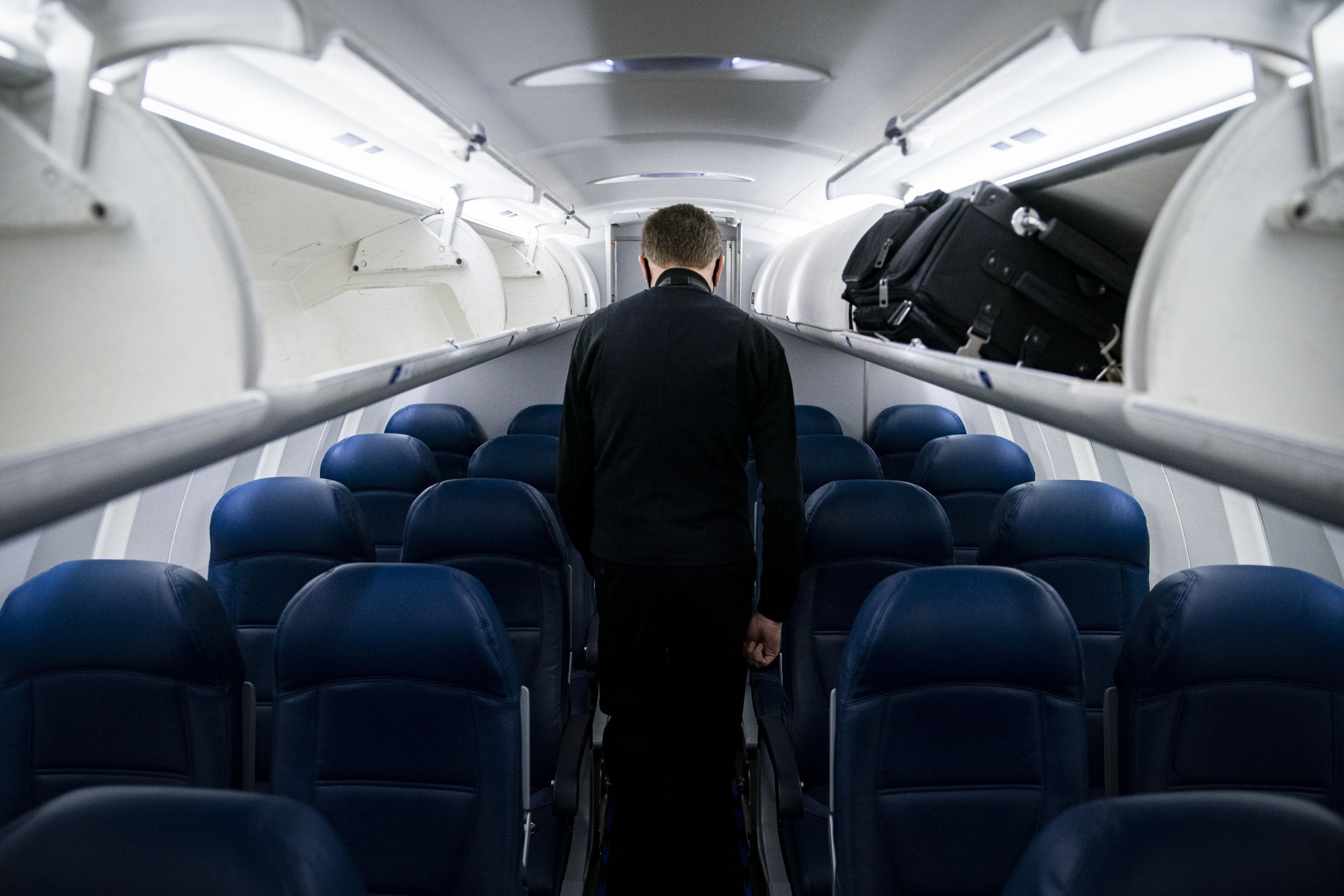 一名空中乘务员在北卡罗来纳州莫里斯维尔的罗利-杜罕国际机场的达美航空公司飞机上行走。