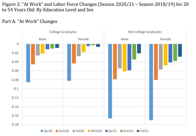 受过更多教育的人可以在家工作,而那些从事面对面服务职业的人则经历了就业大幅减少。黑人女性受到的负面影响更大。