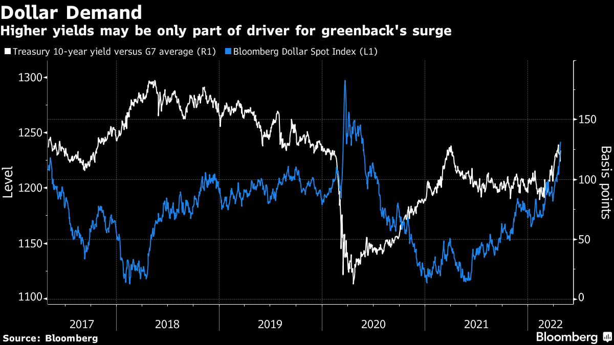 基准国债收益率飙升至疫情后的高点,但这只是将它们重新置于上个十年下半年的范围内。与此同时,美元正飙升至在疫情恐慌之外很少见的水平。这凸显了世界再次面临美元短缺的前景,因为美联储正着手结束为抗击疫情而实施的极端刺激措施。