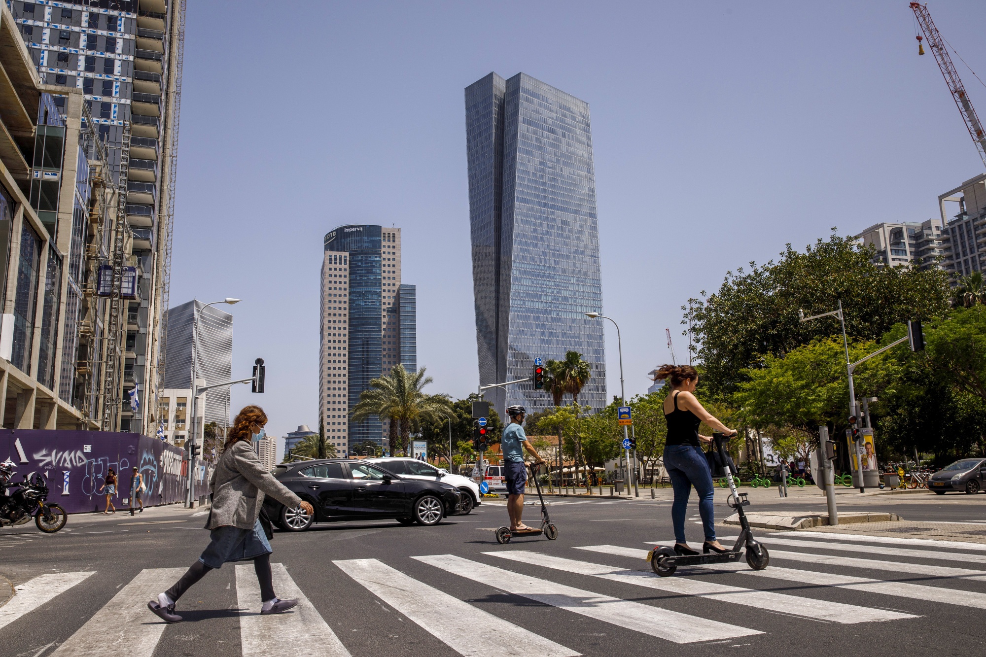 通勤者在2021年4月30日背景下穿过阿兹里埃利塔楼大厦的街道。技术工作者的涌入为特拉维夫的街道带来了更多的电动滑板车。