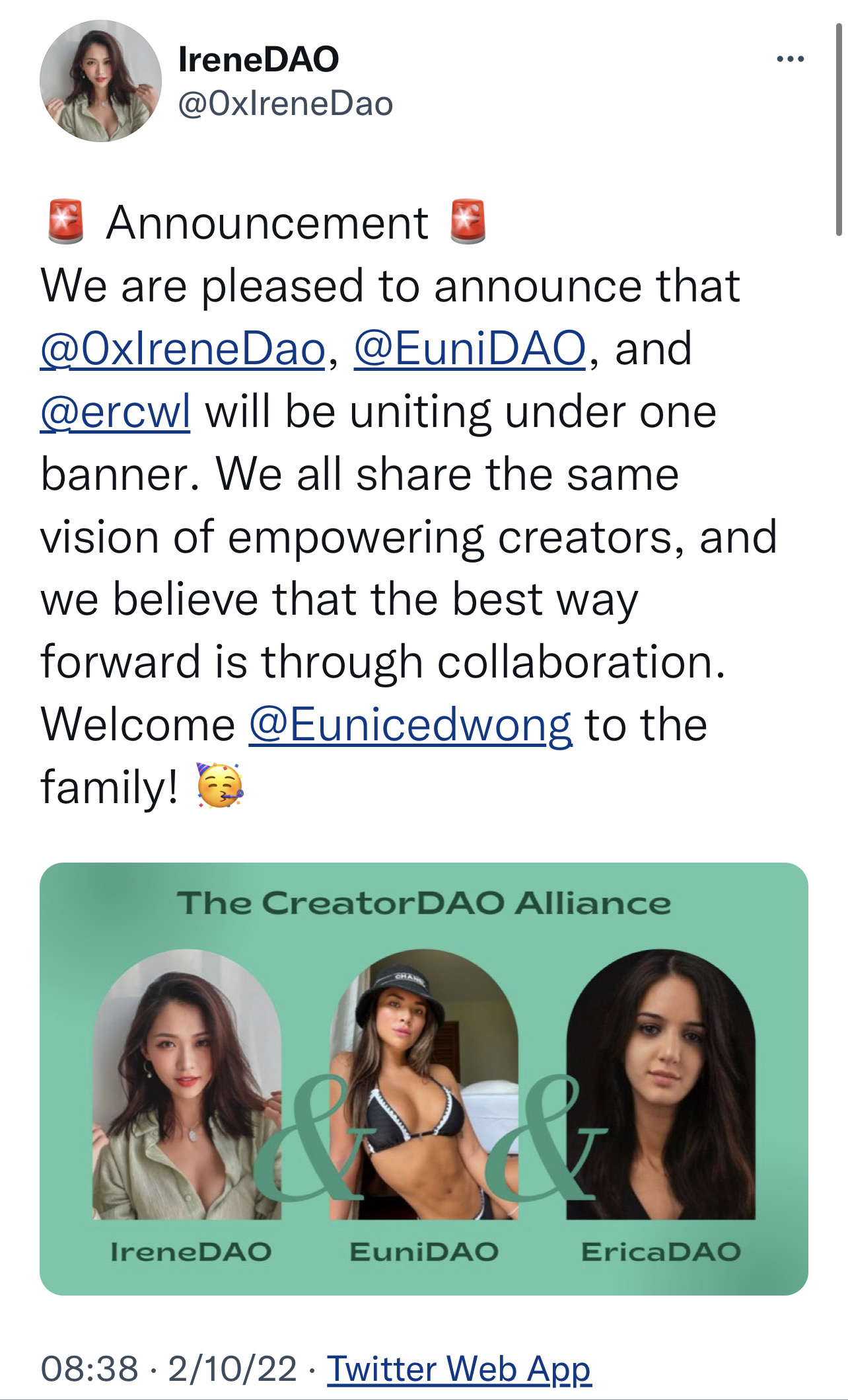 来源: @OxIreneDao](https://twitter.com/0xIreneDao/status/1491768491871174665)关于每个DAO的simp是否应该获得完全相同的福利,引发了争论,因为联盟的创始人Irene Zhao为团队带来了更多的经验和奖励。赵的联合创始人本杰明·唐说,另一个团体EuniDAO希望联盟将他们的奖励提升到与其他人相同的价值。“这让很多IreneDAO成员感到不舒服 — 所以他们决定把他们踢出去,”唐补充道。
