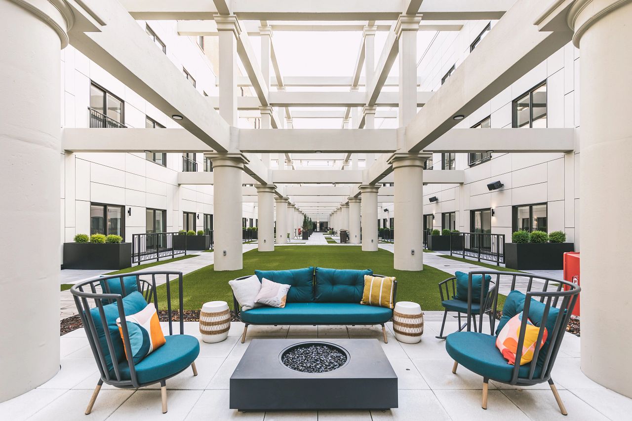 这是在翻新梅公司大楼时面临的挑战之一,Noble说。这座建筑于1974年被列入国家史迹名录,占据整个城市街区,超过900,000平方英尺 — 在翻新期间,有足够的空间在建筑内部创造停车位,Noble指出。翻新还包括增加了一个三层的露天中庭,为室内公寓引入自然光。