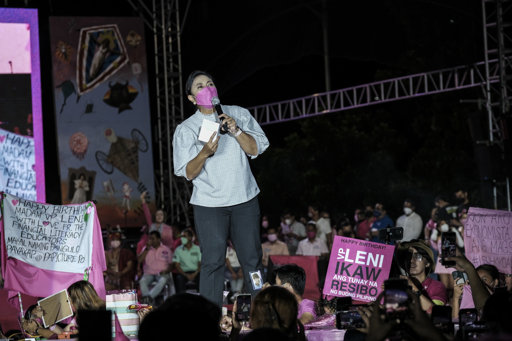 莱尼·罗布雷多(Leni Robredo)在4月23日的帕赛市竞选集会上发表讲话。