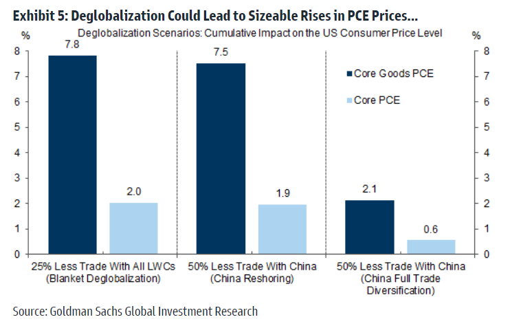 无论是“全面去全球化”还是大规模将生产重新迁回美国自中国,高盛预测年通胀率(不包括能源和食品成本)将提高0.4个百分点。