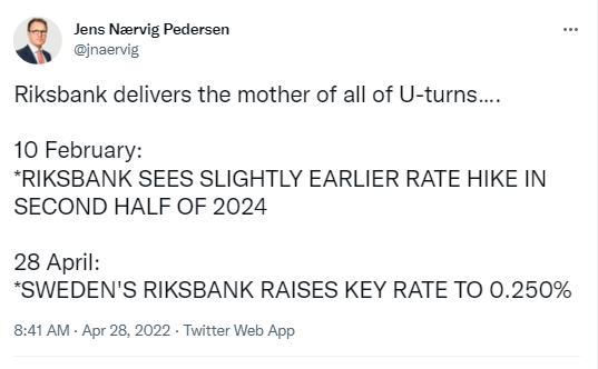 - 瑞典政策转变 | 瑞典央行提高了利率,并暗示将进一步加息,完成了货币政策的转变,加入全球同行抗击通胀。