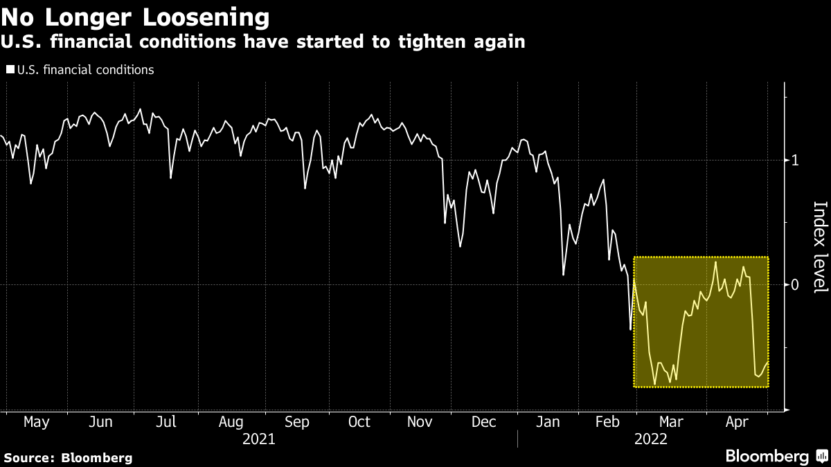 金融状况——股票和债券市场压力的综合快照——在过去一周终于开始收紧,随着股市降温。彭博指数显示,除了2020年的冠状病毒冲击外,状况接近2018年以来的最低水平。