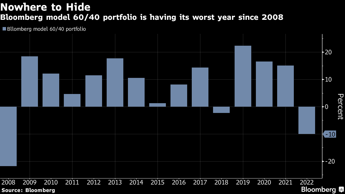 我过去曾取笑过60/40投资组合的讣告,但鉴于表现非常糟糕,现在是时候再次检查了。一项彭博模型跟踪的60%股票和40%固定收益证券组合在2022年已经下跌约10%,迄今为止经历了自2008年以来最糟糕的一年。