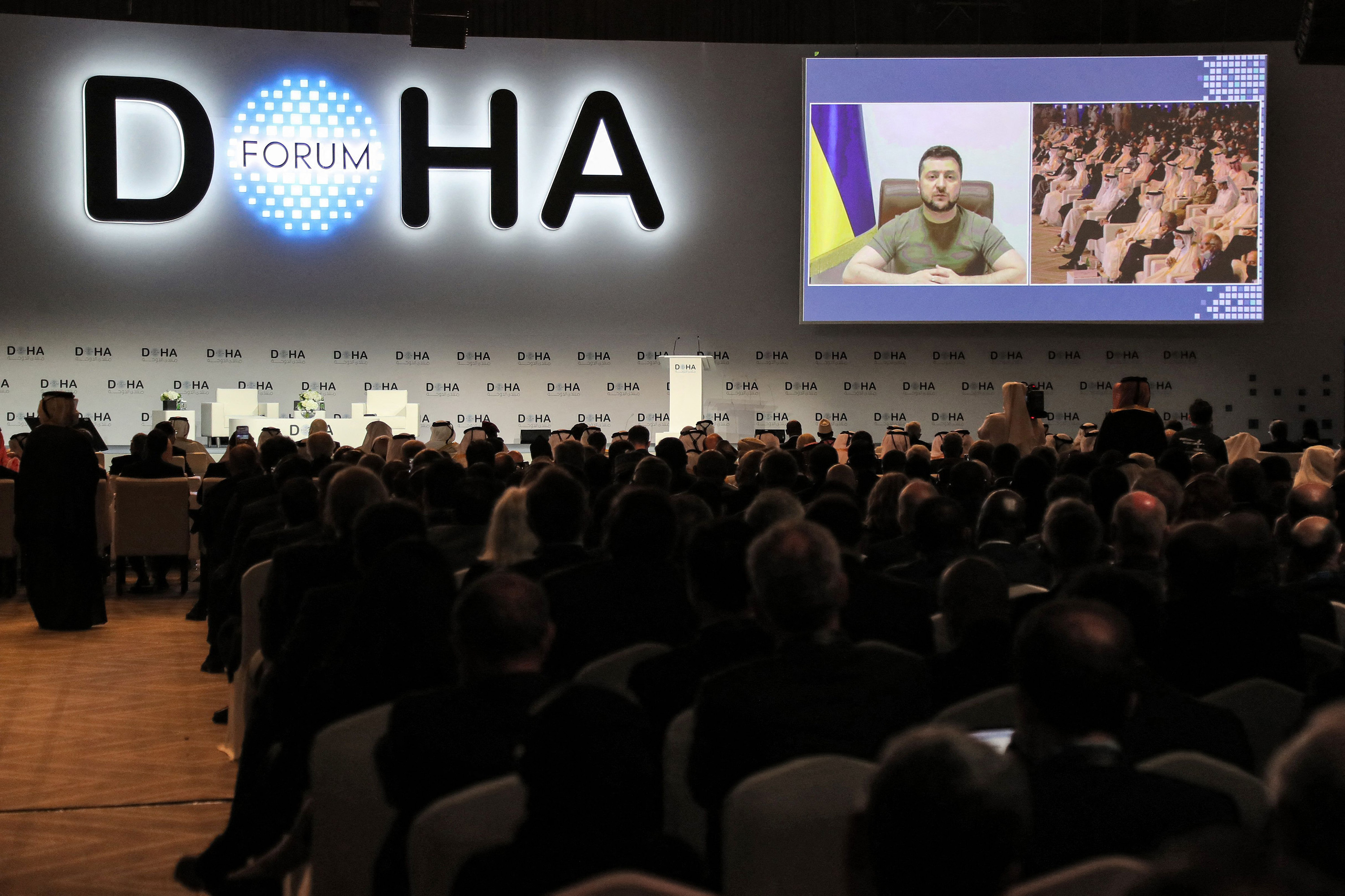 弗拉基米尔·泽连斯基在三月26日卡塔尔多哈论坛的视频讲话中出现在屏幕上。摄影师:卡里姆·贾法尔/法新社/盖蒂图片社今年三月举行的多哈论坛外交政策会议吸引了近4000人参加,包括欧盟首席外交官若瑟普·博雷尔。乌克兰总统弗拉基米尔·泽连斯基因一段视频讲话而受到长时间的掌声,他在讲话中表示卡塔尔可以阻止俄罗斯将能源用作“勒索世界的武器”。