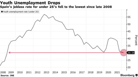 西班牙25岁以下人群的失业率在第一季度降至自2008年12月以来的最低水平,为30.2%,男性和女性青年失业率均出现类似下降。根据西班牙国家统计局INE的数据,同期整体失业率意外上升至13.7%。冠状病毒大流行对西班牙劳动力市场造成了特别严重的影响,青年失业率尚未恢复到疫情前的水平。