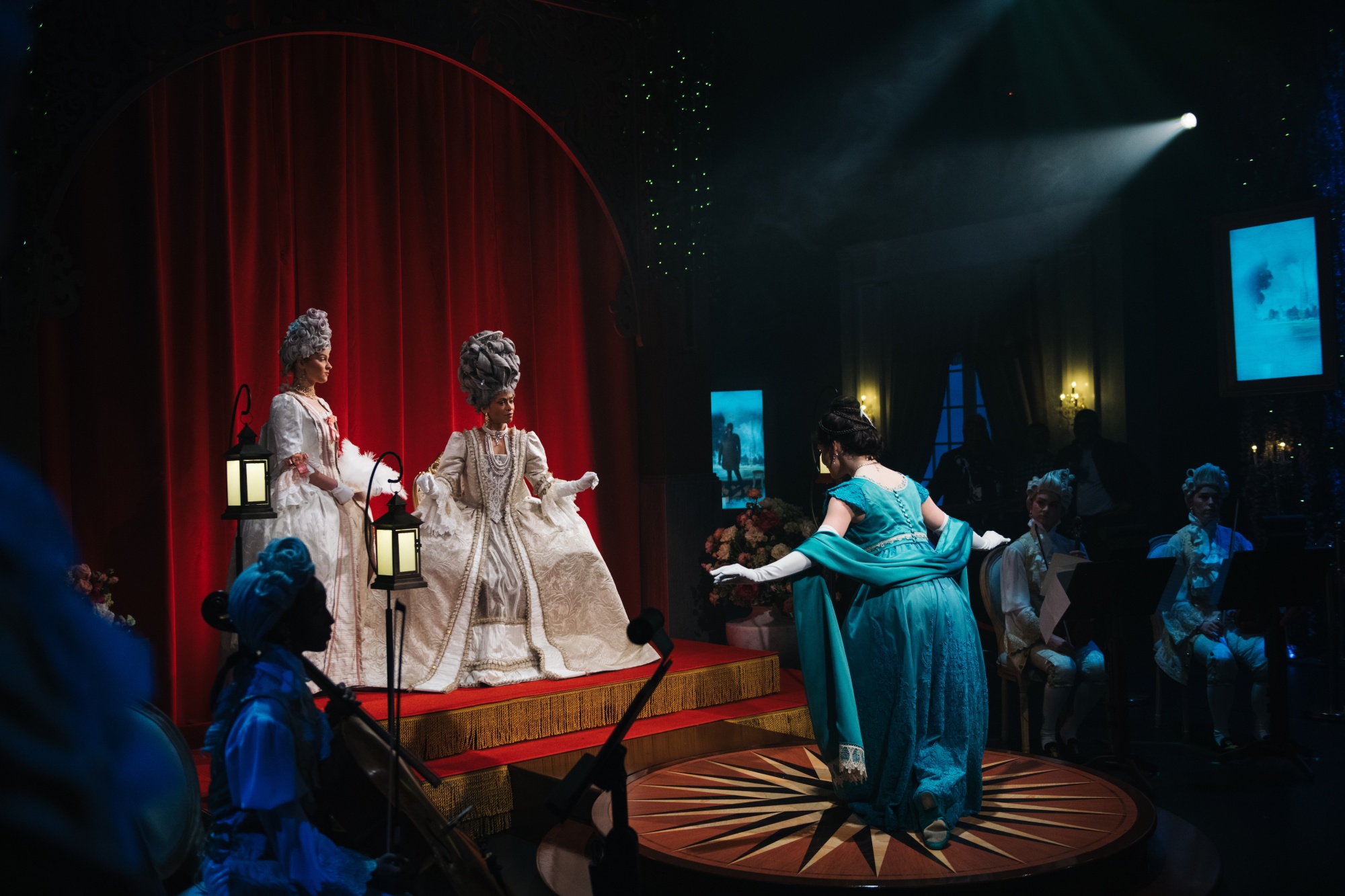 违抗女王者将归还他们的饮料券。摄影师:Shaughn Cooper/Fever通过战略性的灯光、悬挂的纺织品和玻璃柜台,这个前电视工作室已经被改造成一种类似1813年伦敦主题的迪斯科。客人们排队向她的陛下展示自己,她是简·奥斯汀狂热梦中的人物,一直坐在一张被扮演她侍从的演员们装饰的天鹅绒沙发上,显然对此不以为然。一幅著名的17世纪英国贵族的复制画为场景增添了些许逼真感;无论如何,这是自拍的热门背景。当弦乐演奏泰勒·斯威夫特的“Wildest Dreams”时 — 关于配乐稍后会提到 — 参与者,肯定有95%是女士,开始排队。宫廷舞蹈随之展开。