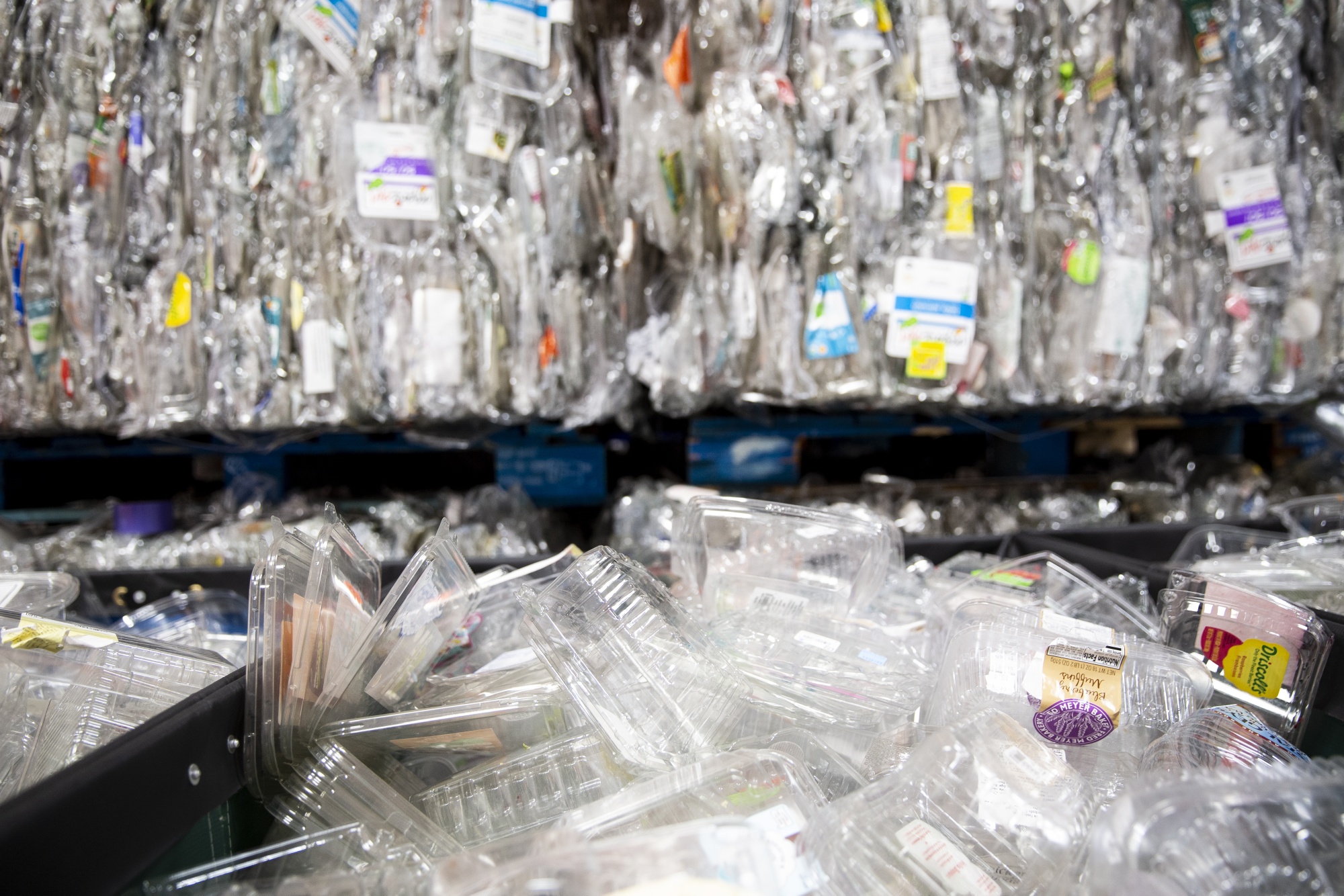 在俄勒冈州波特兰市的 Ridwell 公司仓库收集的塑料透明塑料盒。