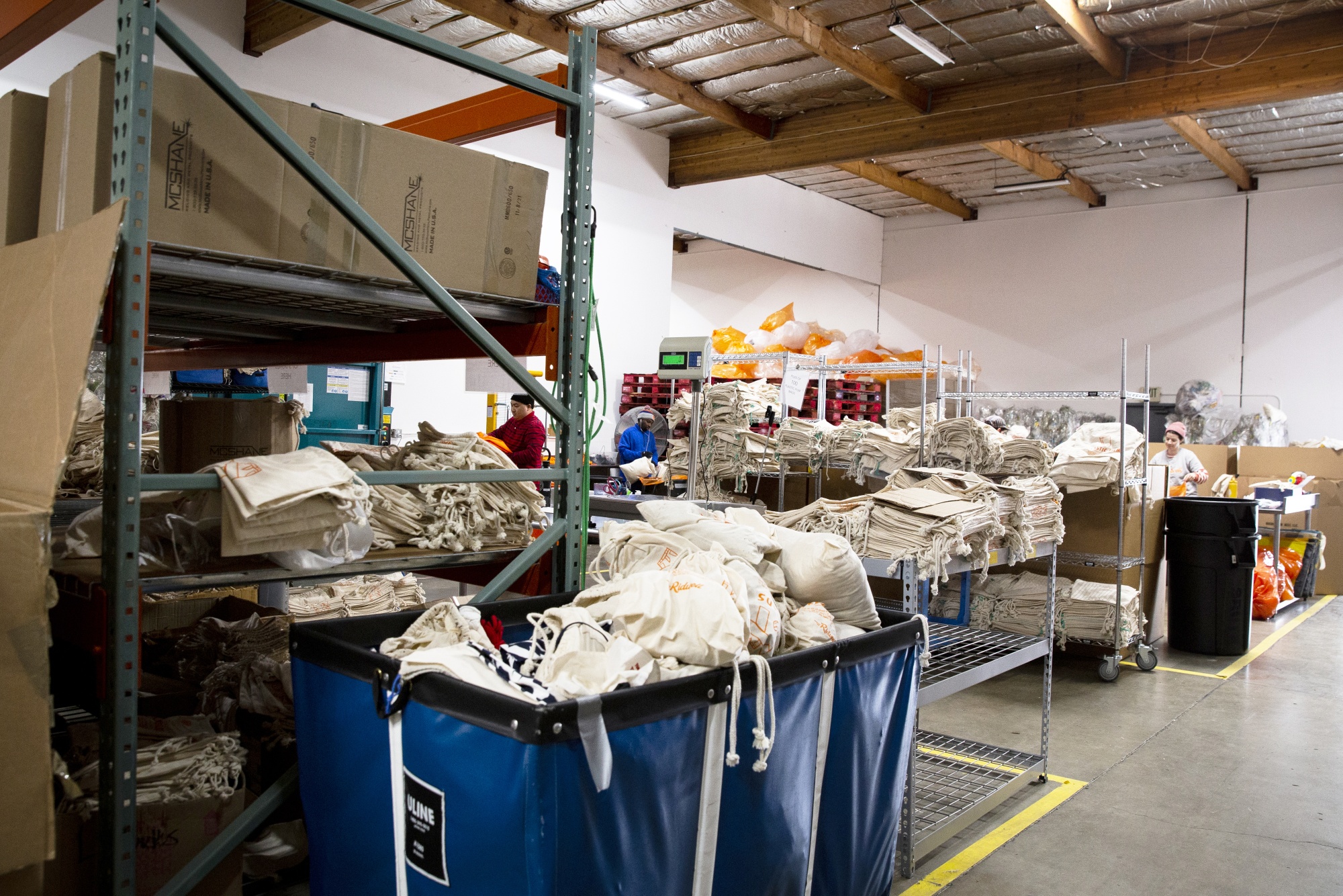 Ridwell 为波特兰居民提供了回收塑料薄膜、电池、灯泡和塑料夹壳容器的方式。摄影师:Moriah Ratner/Bloomberg四年过去了,这个创业项目也已经成为一个更完整的回收业务。在 Ridwell 位于波特兰东北部的一万平方英尺仓库里,员工将塑料袋和蓝色亚马逊包装袋(可回收)与棕色纸垫信封(不可回收)分类。一个打包机被用来将塑料薄膜压缩成紧凑的捆。工业规模的垃圾箱里装满了二手衣服,最终将捐赠给城市的Pioneer Wiping Cloth之类的组织,这是 Ridwell 合作的几个组织之一。