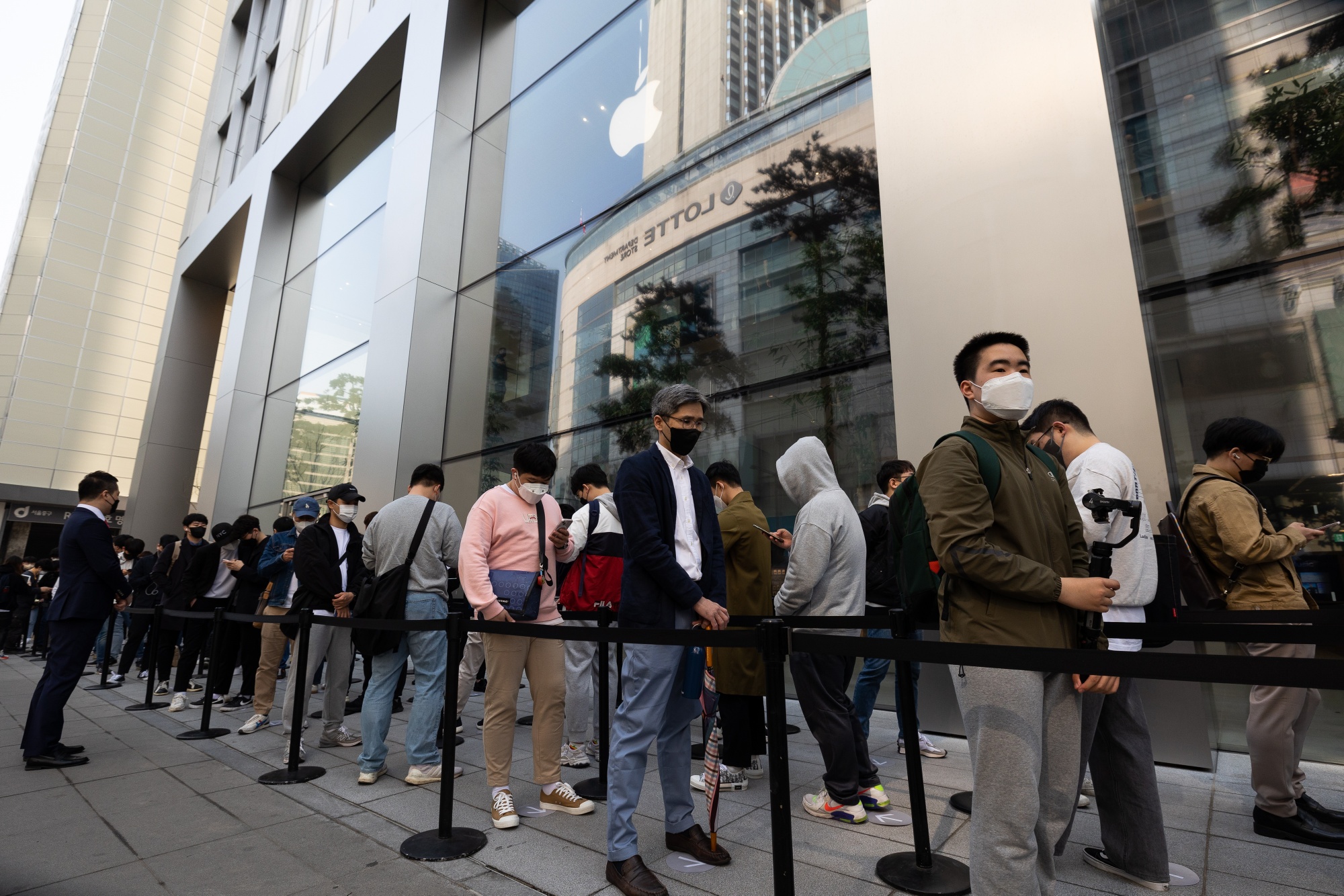 顾客在韩国的一家苹果商店排队等候。摄影师:SeongJoon Cho/Bloomberg**苹果报告创纪录的非假日收益结果。**公司最新的收益报告并非全是坏消息。在截至三月的财政第二季度中,苹果超过了大多数华尔街的估计,并在非假日销售期间创下了有史以来的收入纪录。