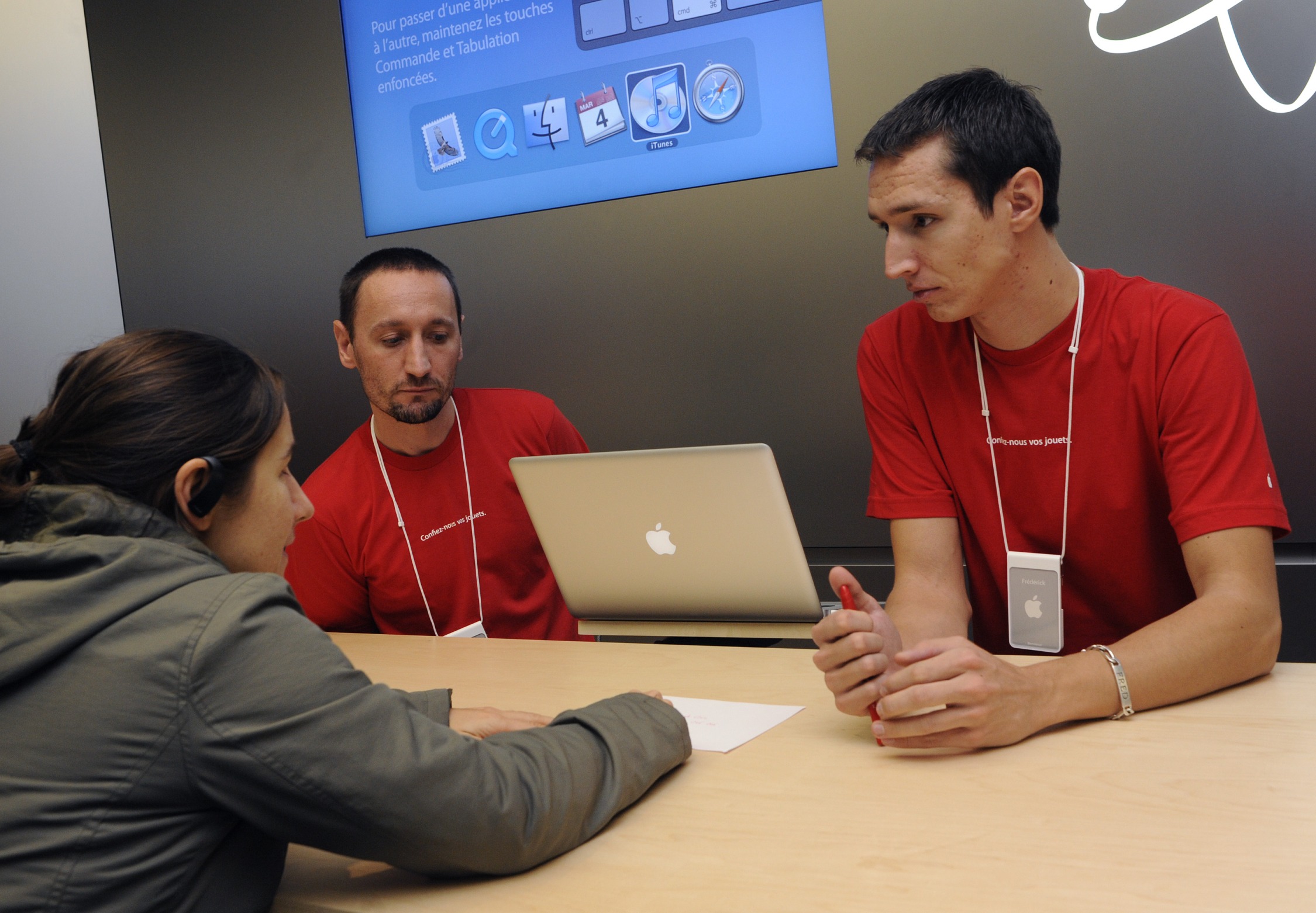 一家老苹果零售店的 Genius Bar。摄影师:Fabrice Dimier**苹果减缓零售店的招聘。**苹果已经开始了一项一些零售员工认为是削减成本的举措。公司正在减缓 Genius(技术支持员工)的招聘,以及一些 Creative 员工(负责培训的员工)。这一转变很可能是公司持续向更多离岸维修转变的一部分。