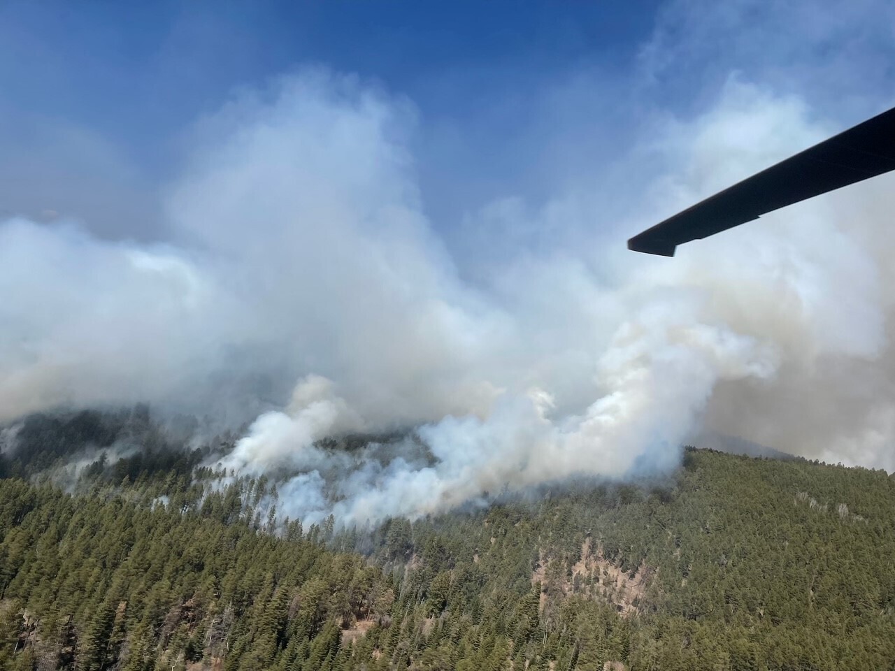 在这张由新墨西哥国民警卫队提供的照片中,一架新墨西哥国民警卫队的UH-60黑鹰直升机参与了灭火行动,从空中用Bambi桶投放了数千加仑的水,对新墨西哥北部的卡尔夫峡谷/隐士峰大火进行了扑救,时间是2022年5月1日星期日。成千上万的消防员正在与西南部破坏性的森林大火作斗争,更多居民正准备撤离。(新墨西哥国民警卫队通过美联社)新墨西哥州拉斯维加斯(美联社)-- 星期一,被风吹起的火焰在新墨西哥的松树覆盖的山坡上蔓延,逼近一个有1.3万人口的小镇,一些居民匆忙往车里装东西,其他人忙着清理家园周围的灌木,警方被召来帮助疏散该州的精神病医院。