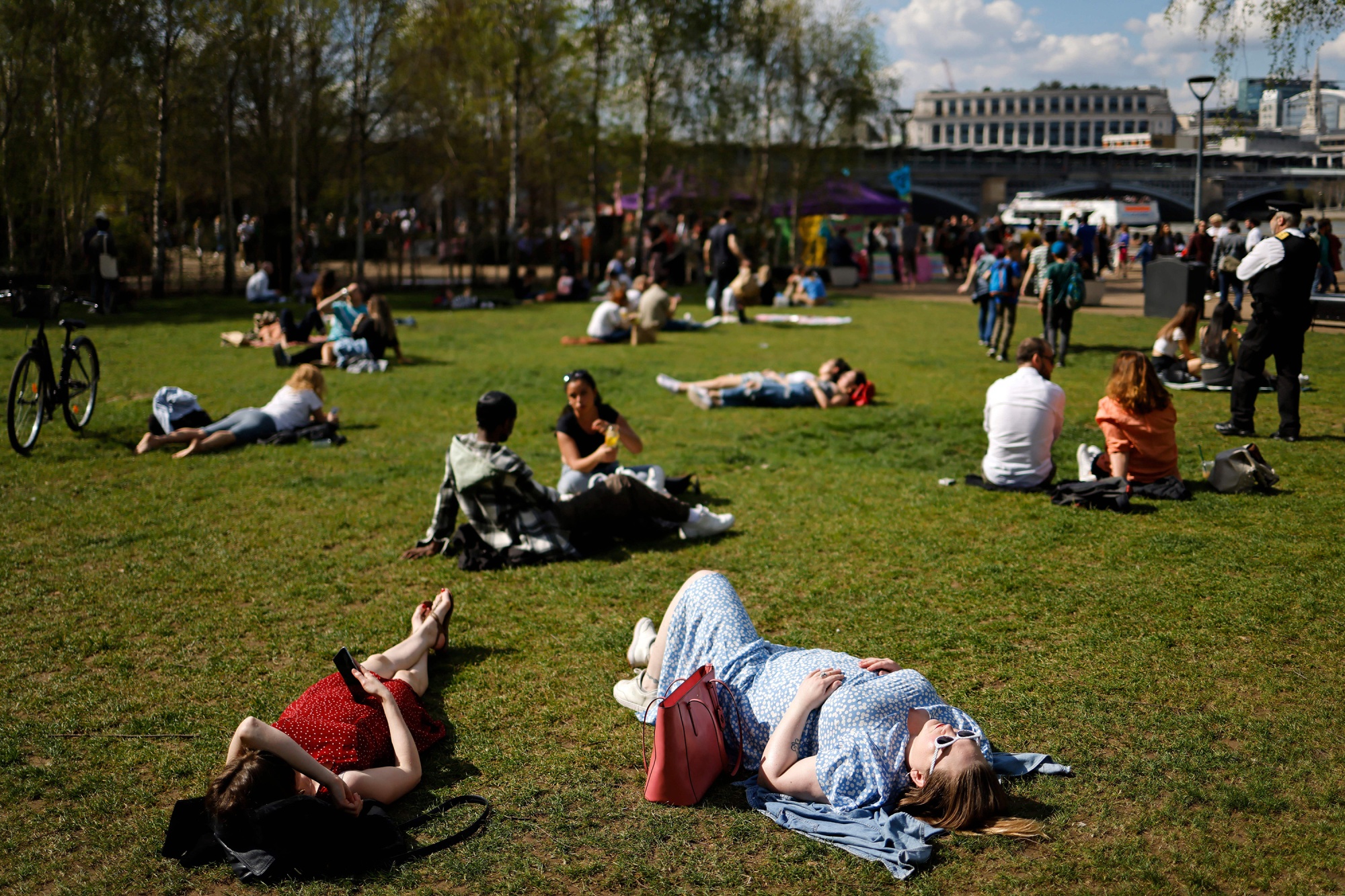 伦敦泰特现代美术馆外的人们在泰晤士河南岸晒太阳。