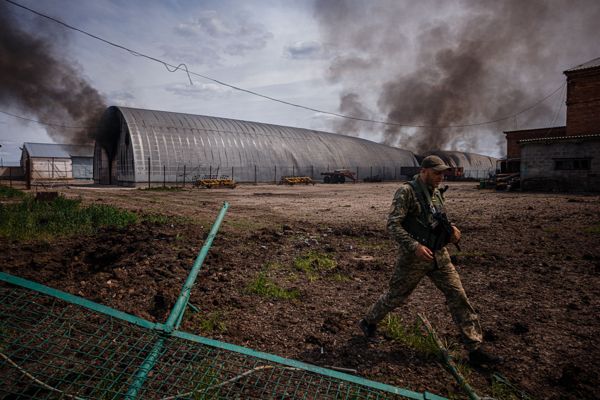乌克兰地方防御部队成员在俄罗斯炮击后经过一栋燃烧的建筑物,拍摄于5月4日的乌克兰特米里夫卡。