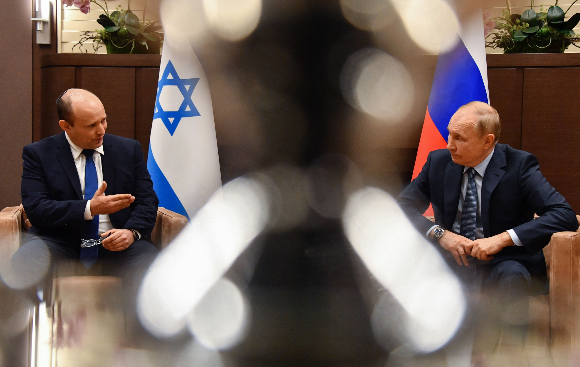 弗拉基米尔·普京,右,和纳夫塔利·贝内特在2021年会面。摄影师:叶夫根尼·比亚托夫/斯普特尼克/法新社/盖蒂图片社