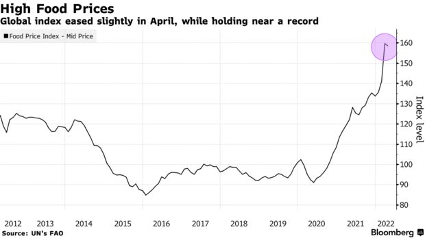 全球食品价格保持接近纪录水平,由于乌克兰战争打乱了作物贸易,加剧了供应紧张并引发了通货膨胀。四月份价格下跌部分是由于植物油需求下降和玉米价格走低。但现在有关印度尼西亚棕榈油供应的不确定性。