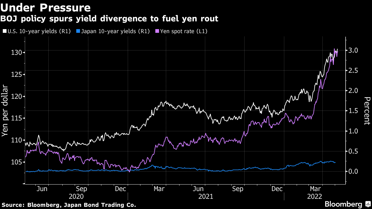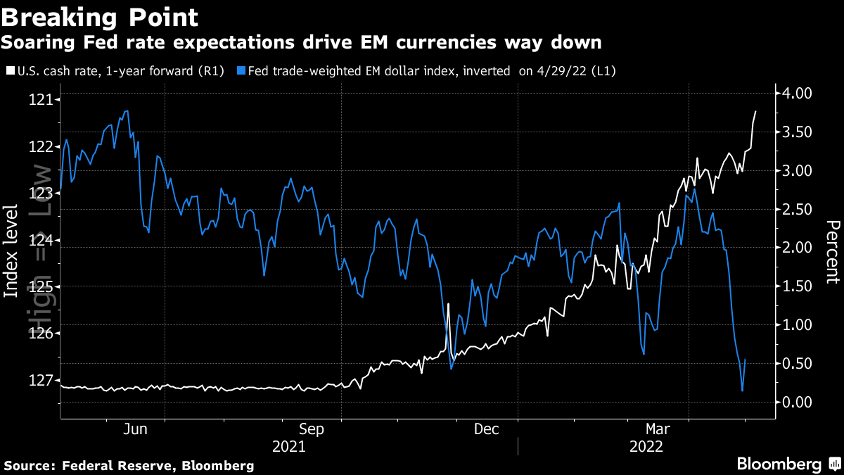 日本的情况突显了对美联储加息预期的激增如何将美元推向越来越高的高度。随着股市下跌,避险需求与更高的国债收益率结合在一起,推动美元在好坏时期都走强 —— 彭博的美元综合指数接近上个月创下的两年高点。