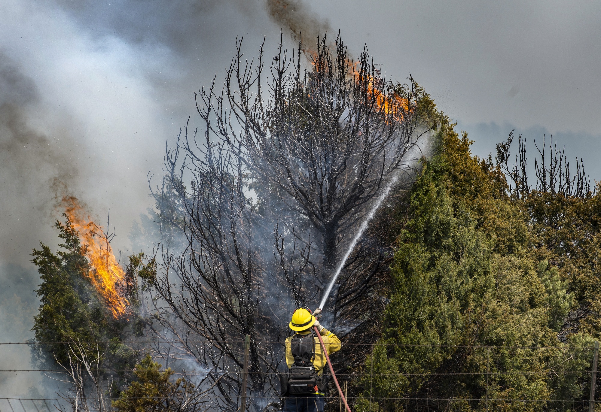 消防员在5月5日靠近新墨西哥州拉斯维加斯的NM 283号公路上扑灭了一棵刺柏树。
