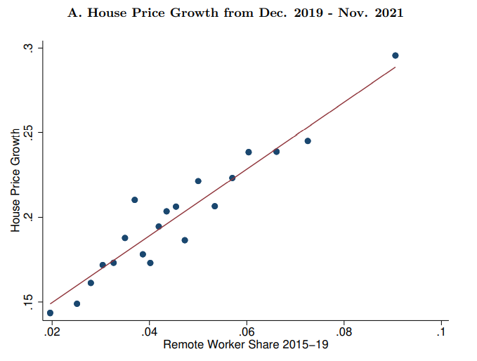 新估算 来自旧金山联邦储备银行的约翰·蒙德拉贡和USCD的约翰内斯·维兰德显示,自2019年底以来,远离办公室的转变导致了全国房价上涨23.8%中的一半。