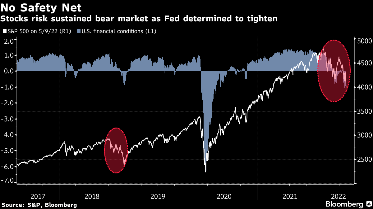 对当前情况更为显著的比较是2018年底险象环生的经历,当时标普500指数(收盘价)出现了19.8%的峰谷跌幅,随后美联储表示将停止加息,并开始降息。标普500指数目前已经从2022年1月3日的高点下跌了约16.8%,而美联储承诺现在将继续快速加息。这意味着金融条件可能会保持或恶化至已经比2018年更为紧缩的当前水平。股市可能会继续下跌。