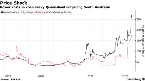 **在化石燃料辩论中,**煤炭主导州的电力价格上涨速度远远快于可再生能源更多的地区。昆士兰下个月的批发电力价格已经超过南澳大利亚相应合同的涨幅。