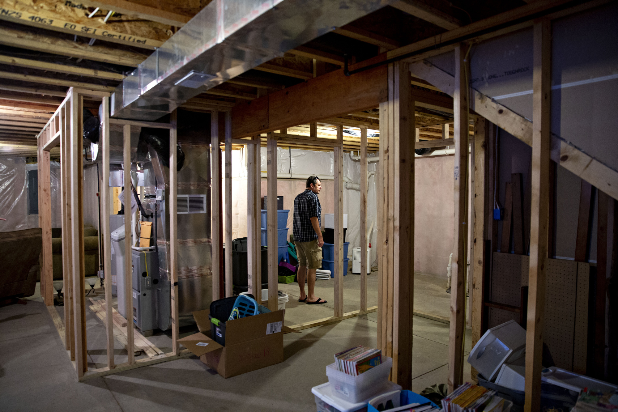 一位潜在的购房者在伊利诺伊州邓拉普市一处待售房屋的参观中查看地下室。摄影师:丹尼尔·阿克尔/彭博社