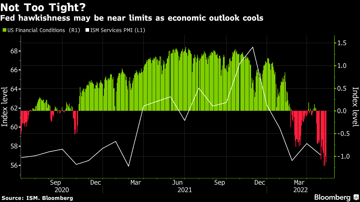 金融状况现在已经像疫情高峰时期一样紧张 — 那时美联储采取了大规模宽松政策来刺激经济复苏。现在,政策任务是以持续且希望可持续的方式降低经济热度。目前,服务业活动已经从最近的高峰回落,大约低于其五年平均水平一点。市场显然担心紧张的状况会使经济受到过度冷却。鲍威尔似乎也意识到了风险。