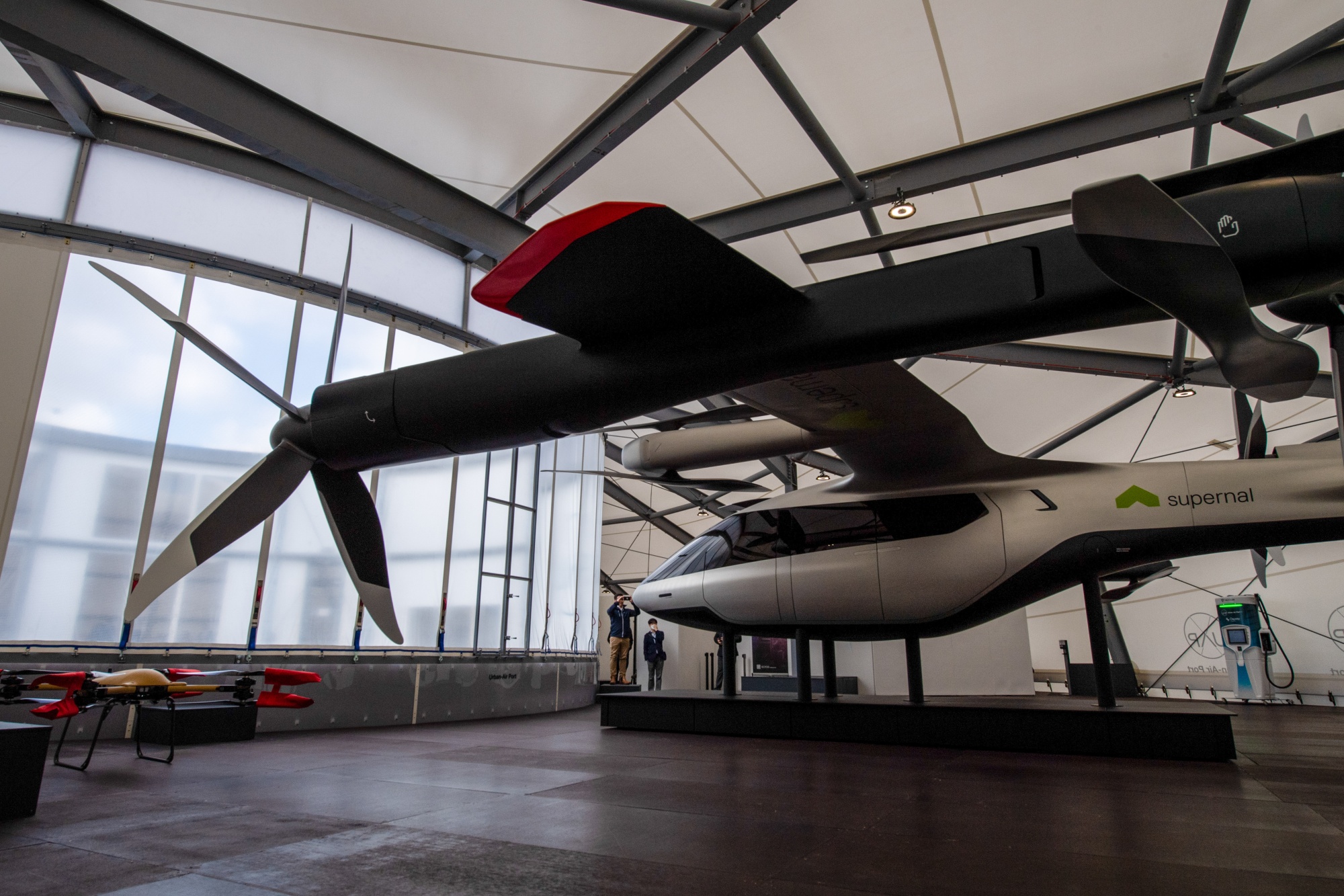 Supernal电动空中车辆(eVtol)模型在Air-One垂直起降机场内展出,4月25日,考文垂。摄影师:克里斯·J·拉特克利夫/彭博社该场地是完全功能的,除了空中出租车本身。由于数十种拟议的eVTOL型号尚未获得监管部门的批准,在考文垂进行为期三周的示范飞行期间,无人机代替了通常可搭载五人的飞行器。