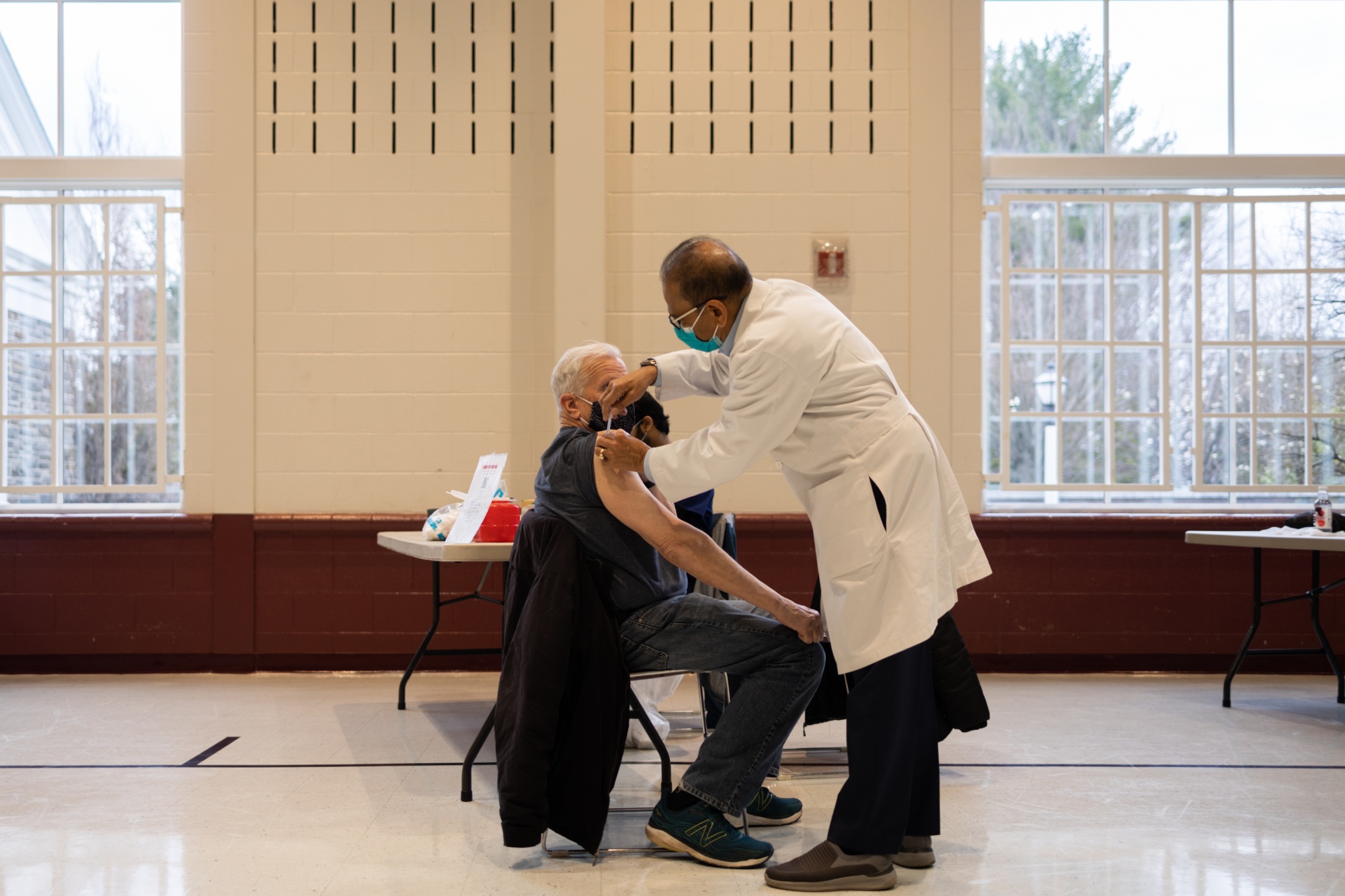 一名医护人员在美国宾夕法尼亚州的疫苗接种点为居民接种新冠疫苗加强针。