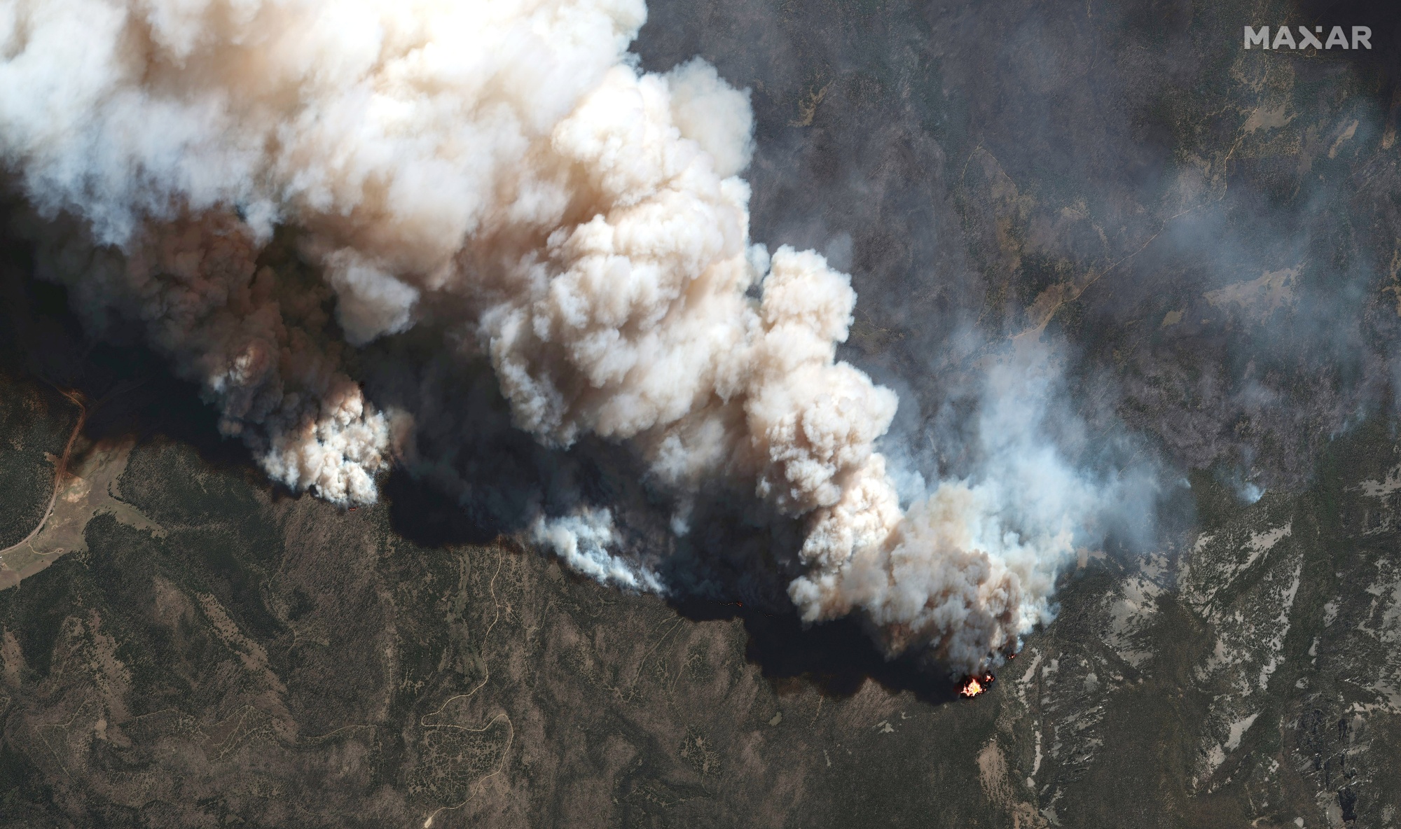 这是Maxar Technologies提供的卫星图像,显示了2022年5月11日星期三在新墨西哥州拉斯维加斯的隐士峰野火的活跃火线。西部的野火今年初的速度非常快。由于气候变化加剧了多年干旱导致的植被异常干燥,被风驱动的火焰正在燃烧,即使是小火灾也对生命和财产构成威胁。(卫星图像©2022 Maxar Technologies via AP)