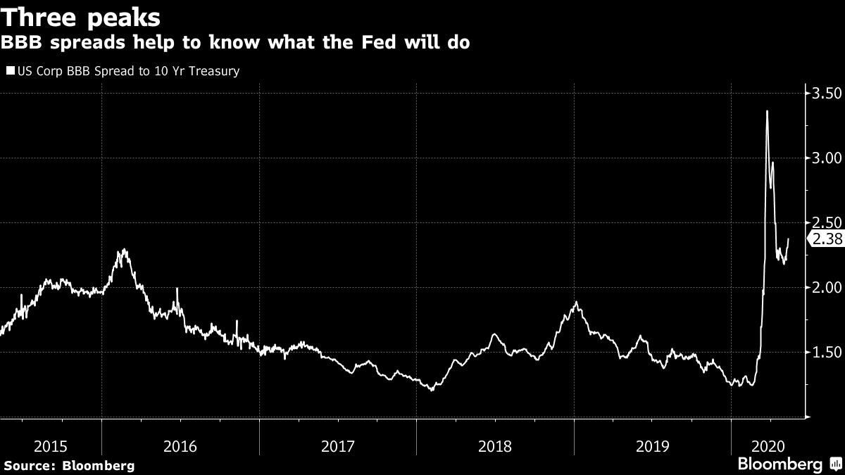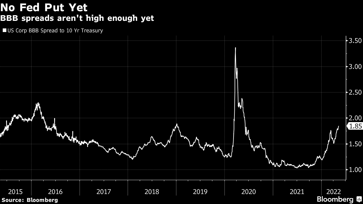如今,BBB利差还没有达到过去三次高峰的水平,但它们正迅速接近2018年12月的水平。