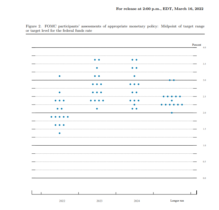 从今年三月的点阵图来看,终端利率将在2023年底前达到2.75 — 3.00%。而中位数显示,2022年年底联邦基金利率将达到2%。但那只有100个基点的距离。由于官员们正在为我们准备在接下来的两次会议中进行如此大幅度的收紧,很明显六月和九月将发布的点阵图将会有很大不同。