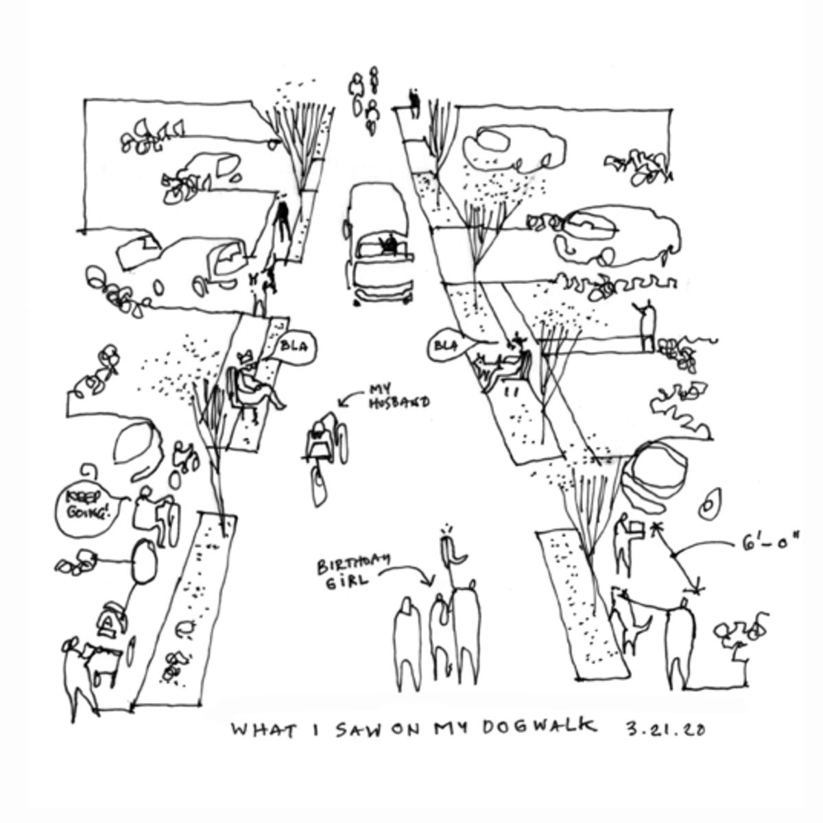 新泽西州米尔本的Carol Hsiung在2020年5月为疫情期间遛狗的新体验画了草图。