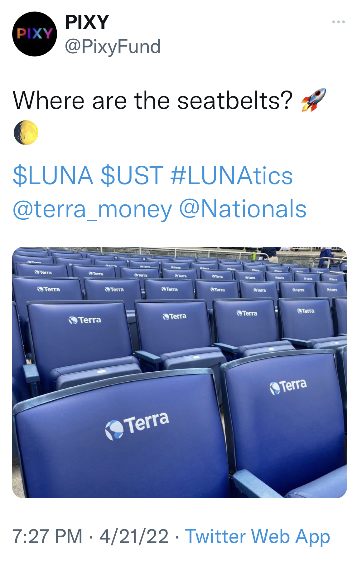任何大都会或费城人(比如我)都会乐意告诉你,华盛顿国民队在美国职业棒球大联盟国家联盟东区排名垫底。奇怪的是,目前对于俱乐部来说,这可能不是最大的尴尬。这个荣誉属于它的Terra Club,这是位于本垒板后面的酒吧和自助餐厅,提供“无与伦比的豪华”,距离击球员仅有“几英尺远”。作为今年二月宣布的为期五年的赞助的一部分,该俱乐部以Terra加密项目命名,本月该项目价值数千亿美元的稳定币失去与美元的锚定后,价值蒸发。
