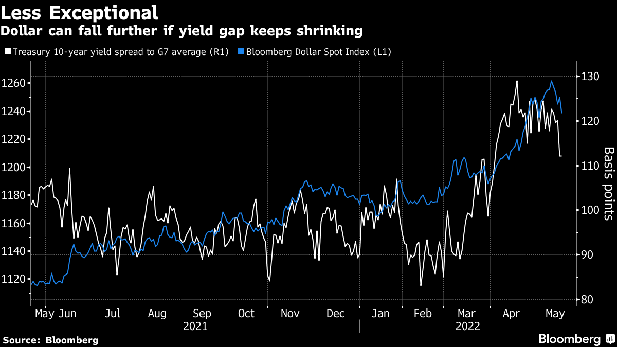 目前,最清晰的迹象表明美国对增长担忧超过了通货膨胀担忧,这体现在美国国债相对主要同行的额外收益率已从疫情后的峰值下降。而随着美国通胀高于英国以外的任何其他主要经济体,这种较小的优势变得更加令人担忧。这有助于解释美元也从非常高的水平回落,尽管在风险厌恶特别强烈时偶尔会有所上升。